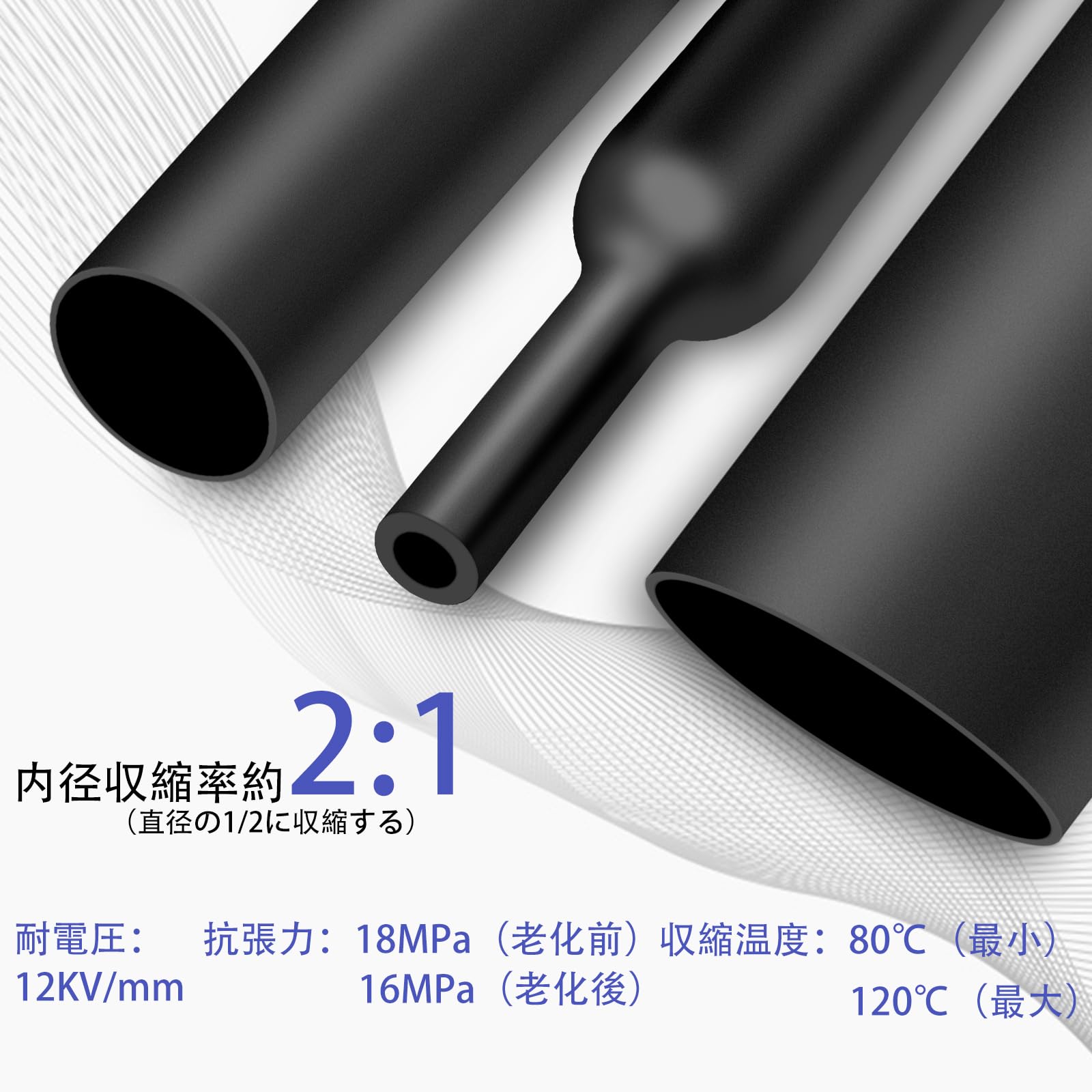 【熱収縮率】:内径収縮率約2:1(直径の1/2に収縮する)。最小収縮温度:80℃、最大収縮温度:120℃。