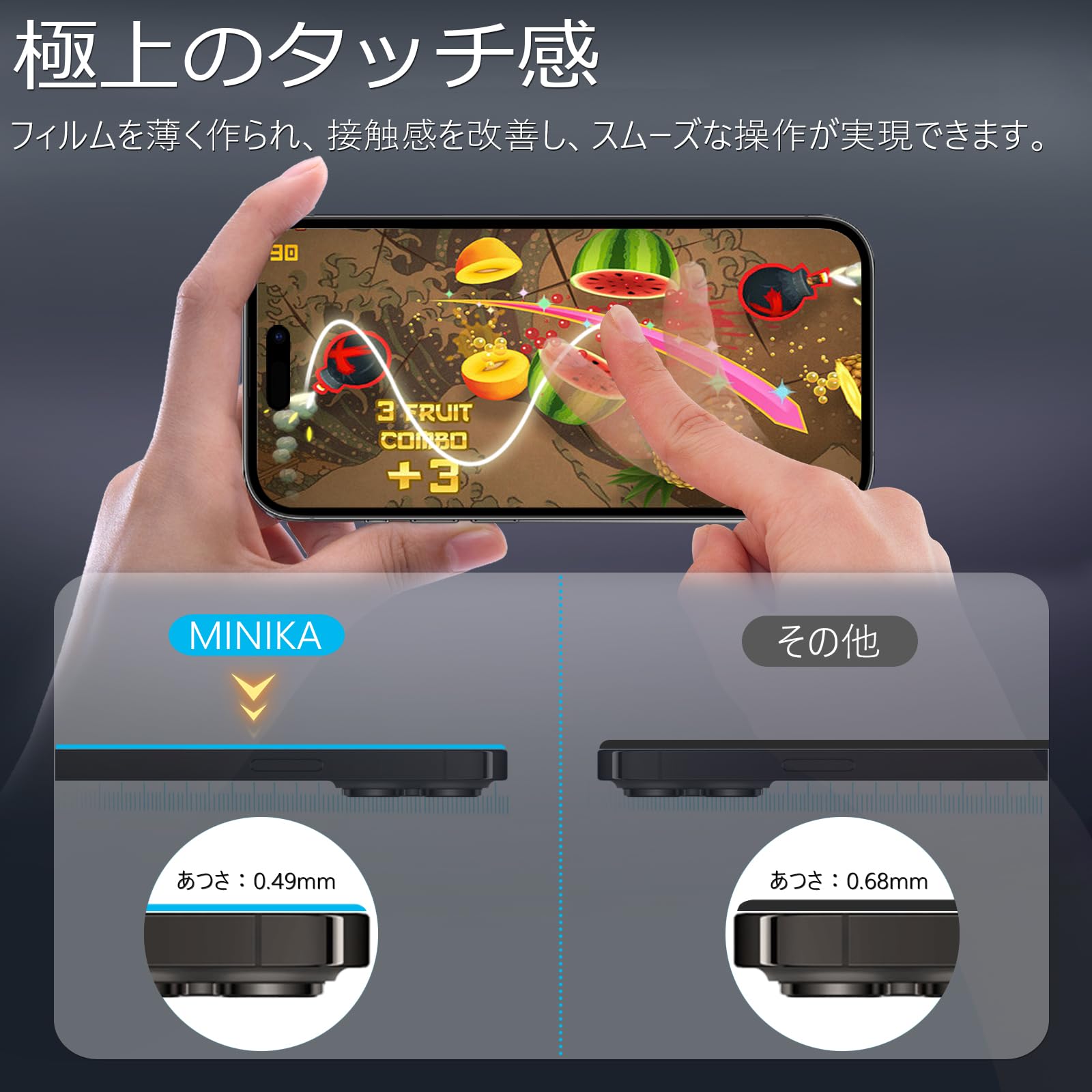 【浮かない,強力吸着タイプ,高感度タッチ】MINIKAのiPhone15プロ保護フィルム,高品質な専用接着剤を採用し、ガラスフィルムを正しく貼り付けた後、約30N以内の引っ張り力に耐えられます。そのため、しばらく使用した後に脱落したり、感度が低下したりする心配も必要ありません。