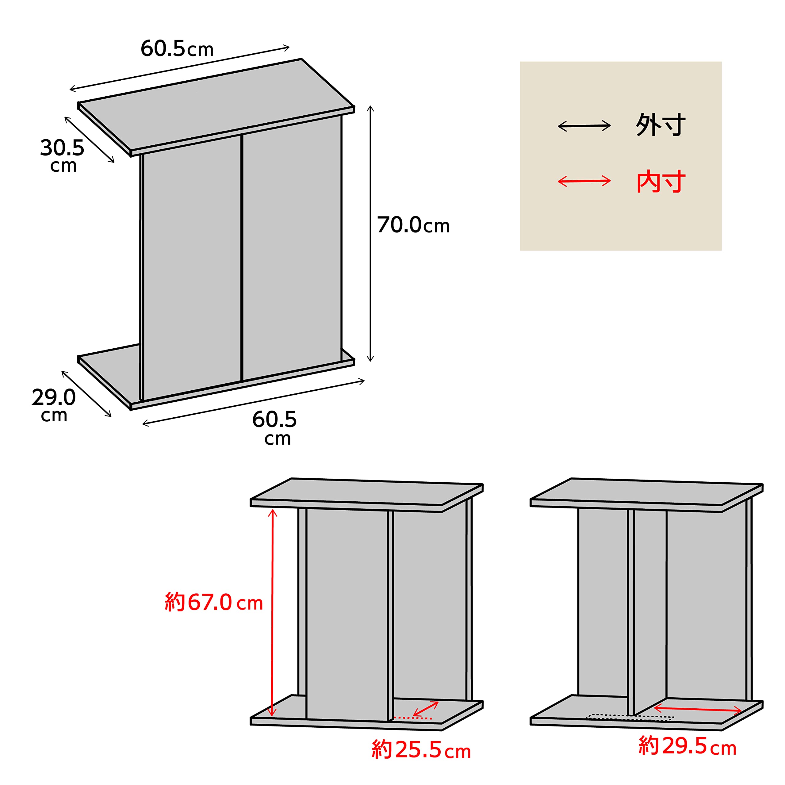●組立サイズ(外寸):約幅60.5×奥行30.5×高さ70.0cm ●重量:約10kg ●適合水槽:幅60cm×奥行30cm以下の水槽 ●耐荷重:約100kg以下 ●材質:木質ボード