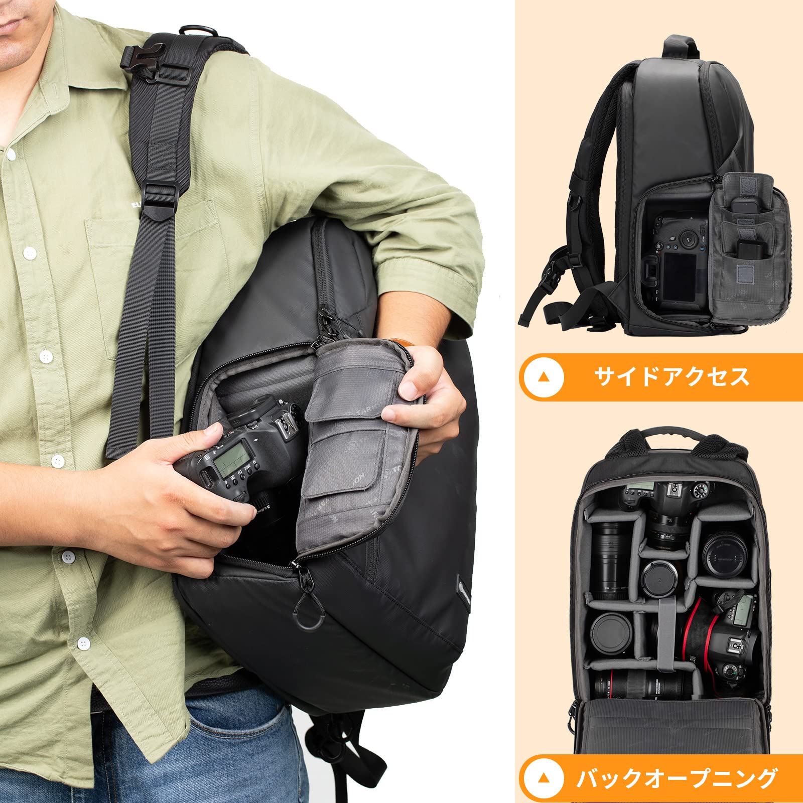 【サイドアクセス】サイドアクセスデザイン、使い勝手がいい。リュックを降ろさないでもそのままカメラを取り出すことができるので、素早く撮影に入れて、シャッターチャンスを逃しません。