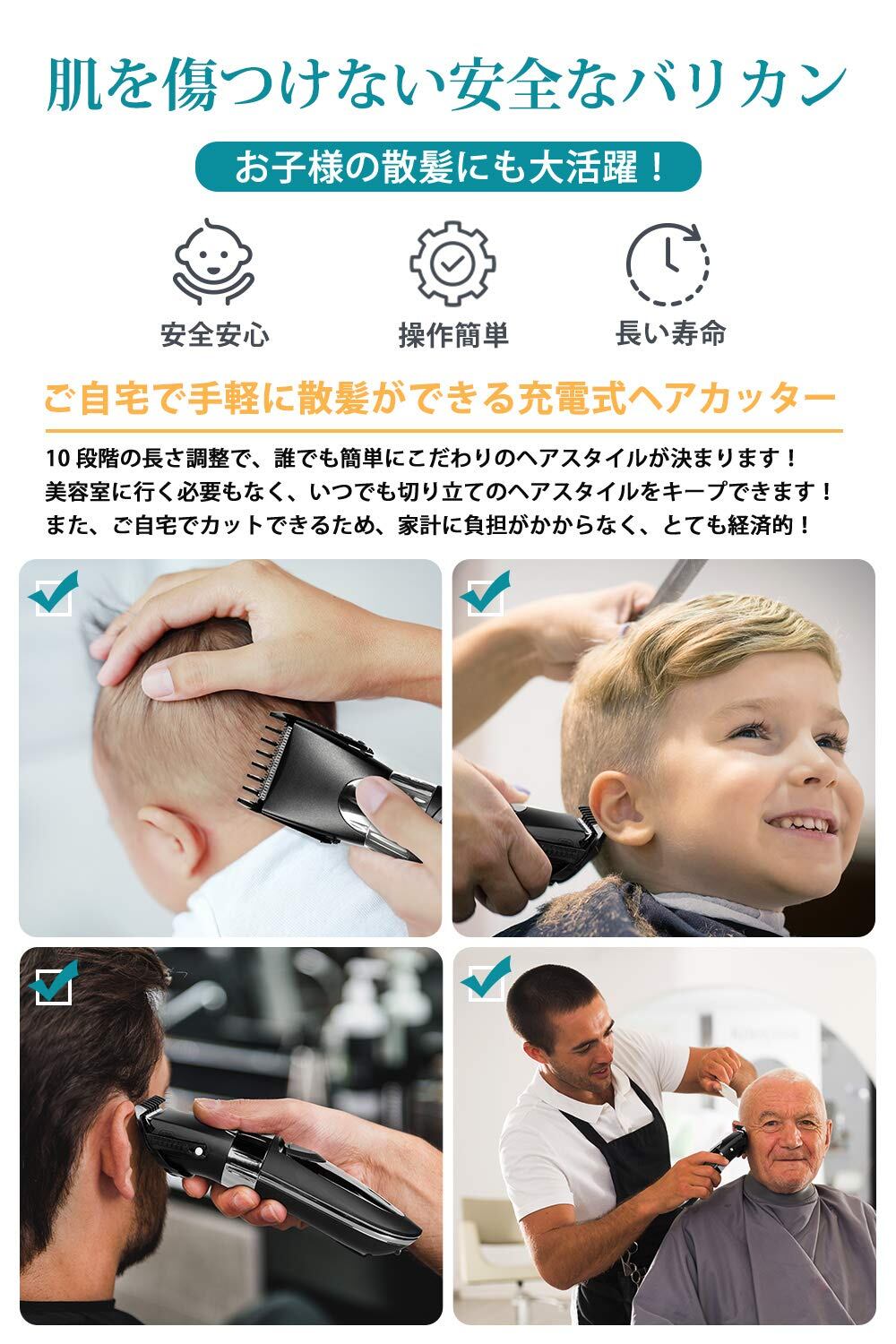 【最新改良版登場&切れ味抜群】業界バリカンの先駆者である弊社は品質にこだわり、従来のバリカンが抱えていた問題点を改善し、切れ味のよい45°鋭角刃を採用し、刃先段差が短いため、エリ足などの輪郭がよりはっきり仕上がります。また髪を逃しにくく、刈り残しを低減することでスピーディーにスタイリングできます。刃の先端は子供専用の良質なステンレス刃と優れたなR面取り刃設計で、滑らかで、剃り効率が高い、肝心な切れ味は素敵、さびなどの心配もなくので長持ちできます。カット性能が良く、髪に絡まずスムーズな切れ味です