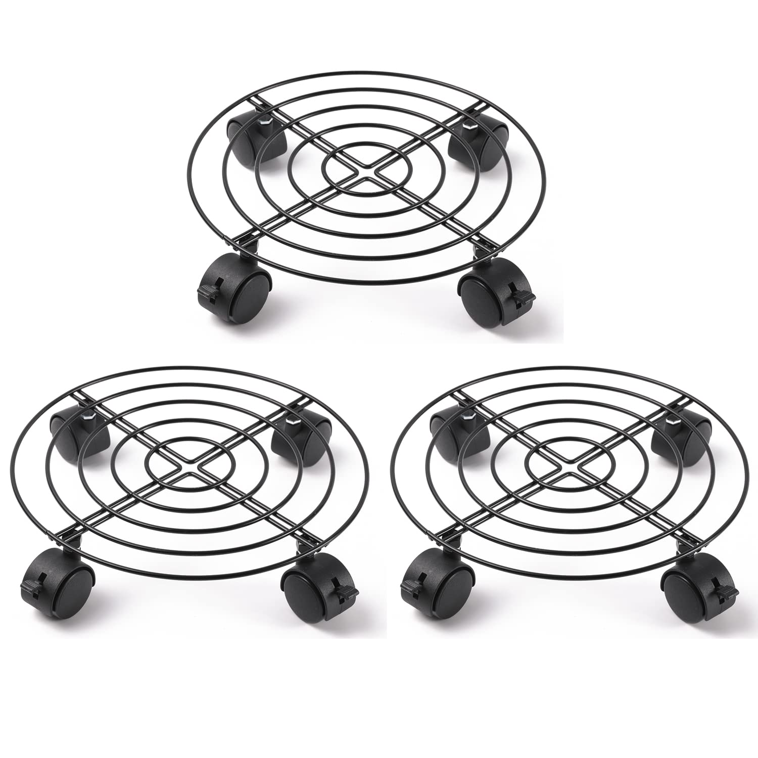 植木鉢台 鉢置台 鉢受プレート キャスター付き ストッパー機能付 花台 金属製鉢置台 移動 掃除楽に 屋内 屋外兼用 直径27cm ブラック 3個 (ブレーキ付)