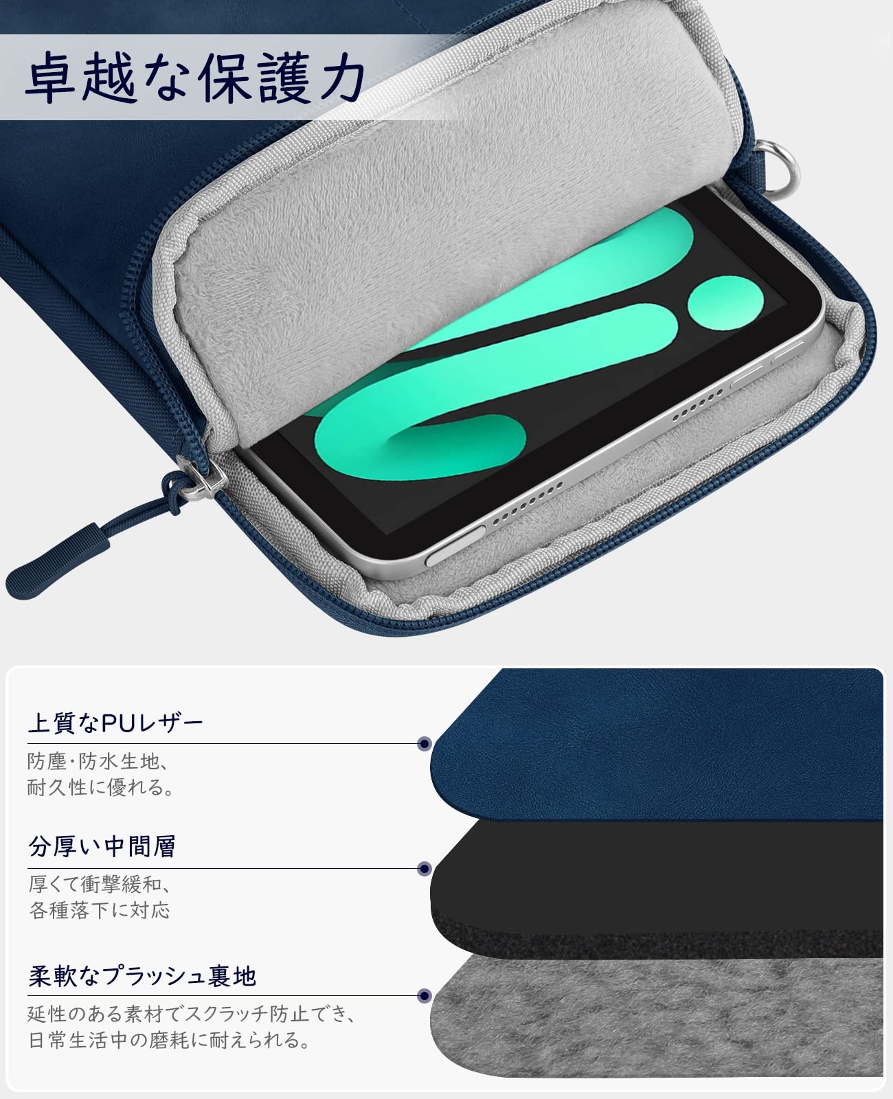 「上質素材採用」 外側はポリエステル+·PUレザーを採用し、耐久性に優れ、少量の撥水・汚れに耐えられ、お手入れはとても簡単です。内側は柔軟なプラッシュ生地で作り上げ、不意による落下時の衝撃を緩和し、デバイス本体やスクリーンをスクラッチから守ります。