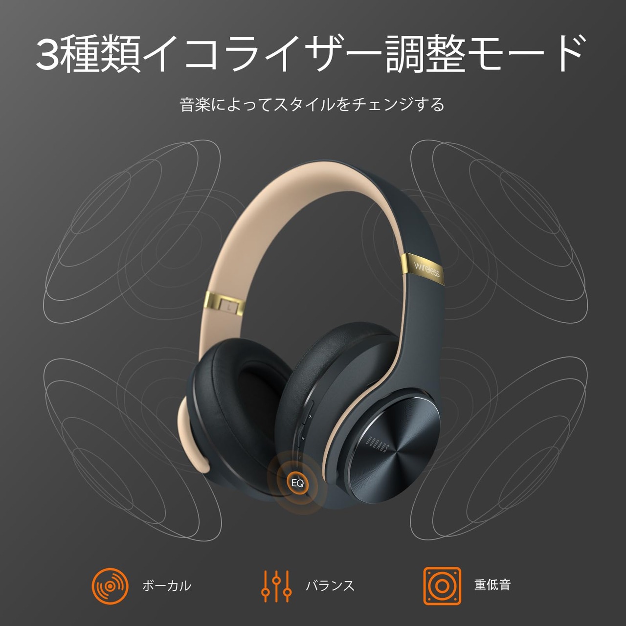 三種類イコライザーモード:1.バランスモード(均衡の高低音体験)2.重低音モード(旋律の低音鼓動を増幅し、澎湃な音楽体験)3.ボーカルモード(低音部分を3 dB減少することで歌手の声の帯域にフォーカス)