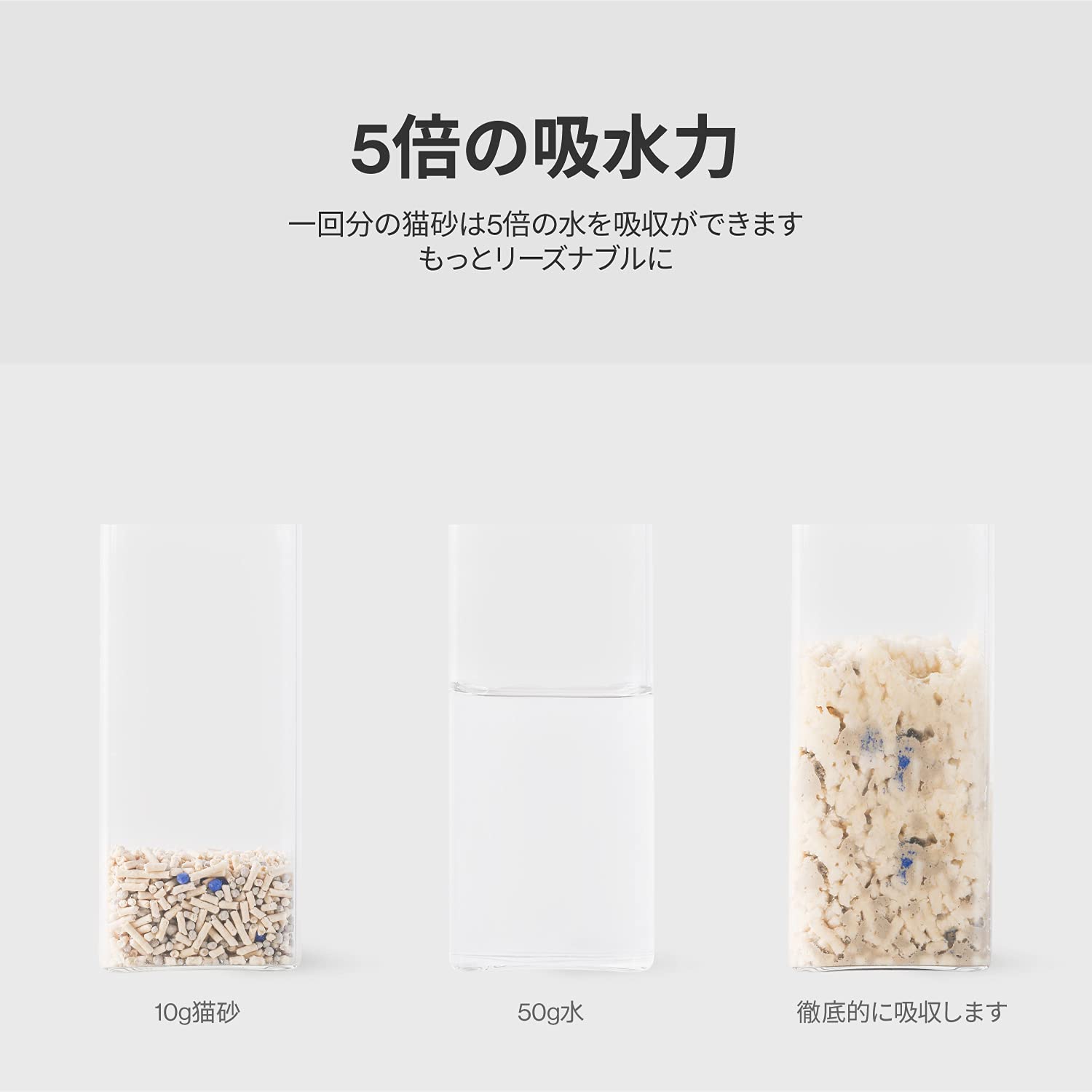 【瞬時に固まる猫砂】 水分を吸うと、およそ3秒で猫砂が固まるようになっています。瞬時に匂いを吸着させるので、嫌な匂いもなく、高い抗菌性も発揮します。