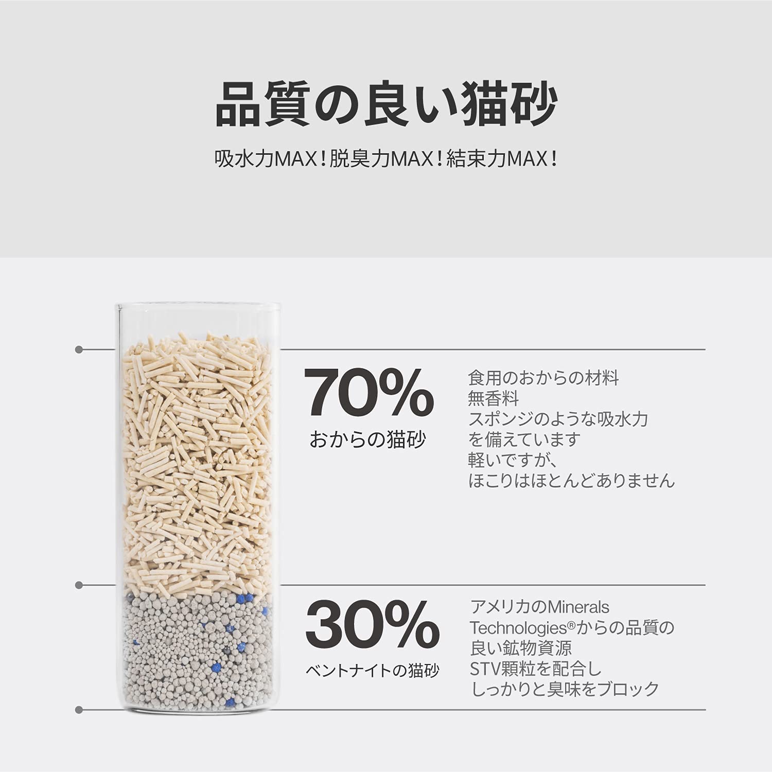 【複数の猫砂をMIX】 消臭力の高いおからに加えて、ベントナイトも加わることでさらにパワーアップ!大きさの異なる猫砂を配合することで隙間がなくなり、水分の吸収率が向上します。
