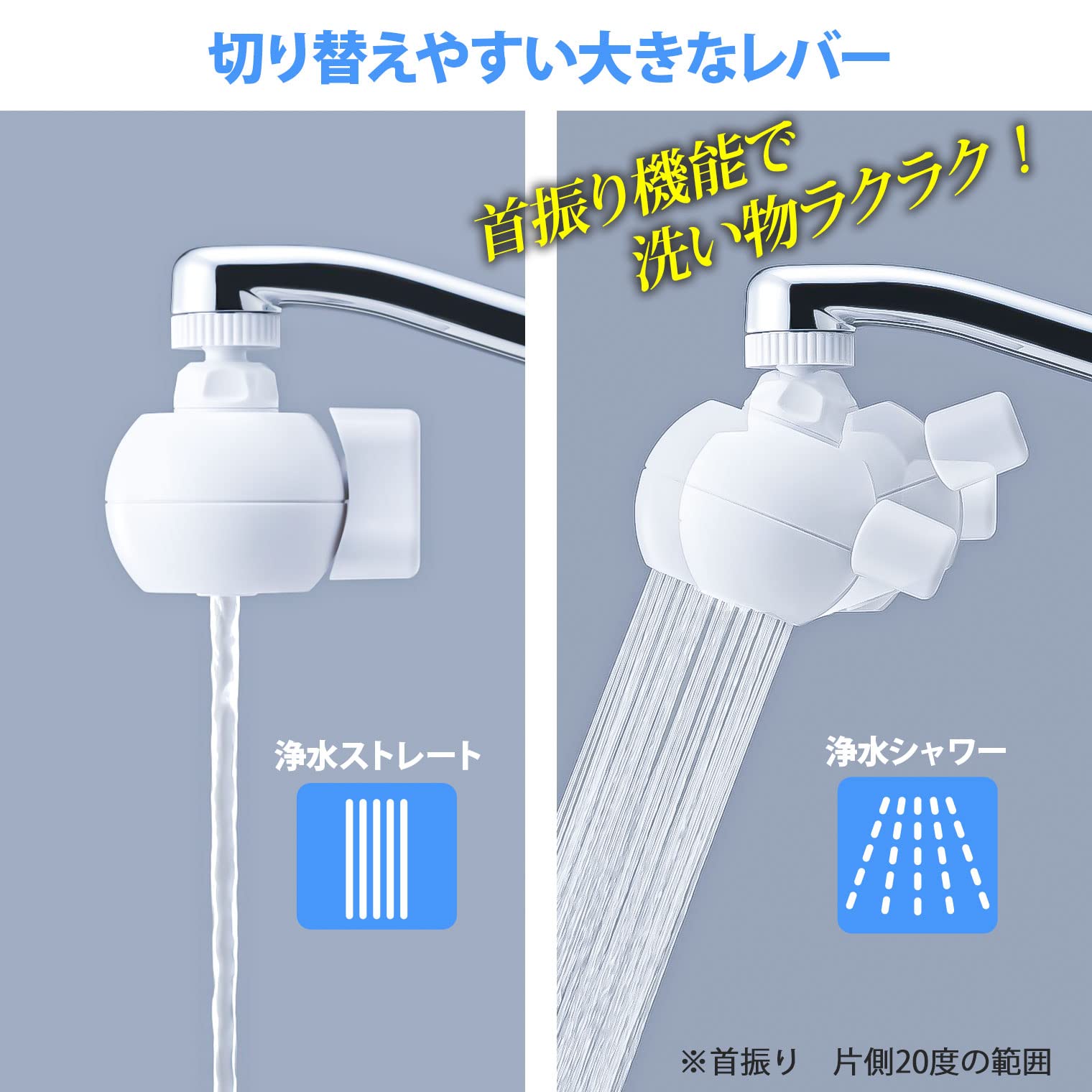 シャワーの角度が変えられる、首振り式の浄水蛇口。ゴミや鉄サビを除去。水道水をおいしいお水に。ネジでガッチリ固定。取り付けも簡単。大きいレバーで「シャワー」「ストレート」の切り替えラクラク。洗い物やシンクのお掃除に、首振り機能が便利です。[サイズ]約7.8×6×高さ7cm[重量]約69g[耐熱温度]70度、120度、140度/[お取替え目安]約3カ月(水質・使用量によって差異が生じます)。[取り付け可能水栓]泡沫水栓(JIS規格品/ネジ部外径22mm)、自在水栓(外径16mm)[素材・材質]ABS樹脂/ ポリアセタール/ シリコン/ 亜硫酸カルシウム・不織布フィルター[生産国]中国(ろ材:日本製)●[取り付けられない水栓](1)外径17.5mm・19mmの丸型自在水栓 (2)外ネジ式泡沫水栓ネジ部外径22mmネジ山ピッチ1.0のもの(ヤンマー・モーエン・グローエ社製) (3)内ネジ式泡沫水栓ネジ部外径24mmネジ山ピッチ1.0のもの(TOTO・グローエ社製等) (4) (3)以外の内ネジ式泡沫水栓 (5)先端にふくらみの無い丸型自在水栓・角型水栓。自動水栓・限定生産品等の特殊水栓。※(1)(2)(3)の水栓の場合、別売品のアタッチメントで取り付けが可能です。●水道水の飲料基準に適合した水でお使いください。●本製品は使い切りタイプです。