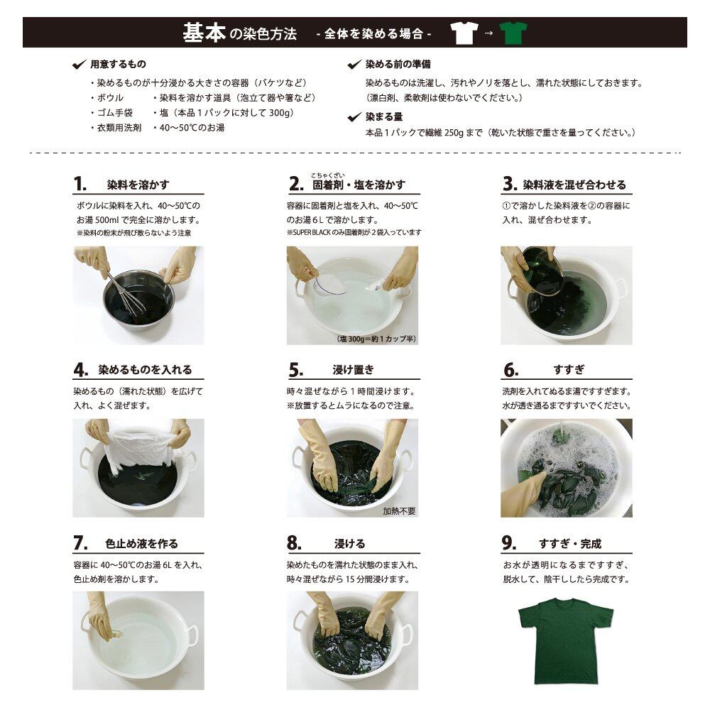 染料・固着剤・色止め剤がセットになった染色キット