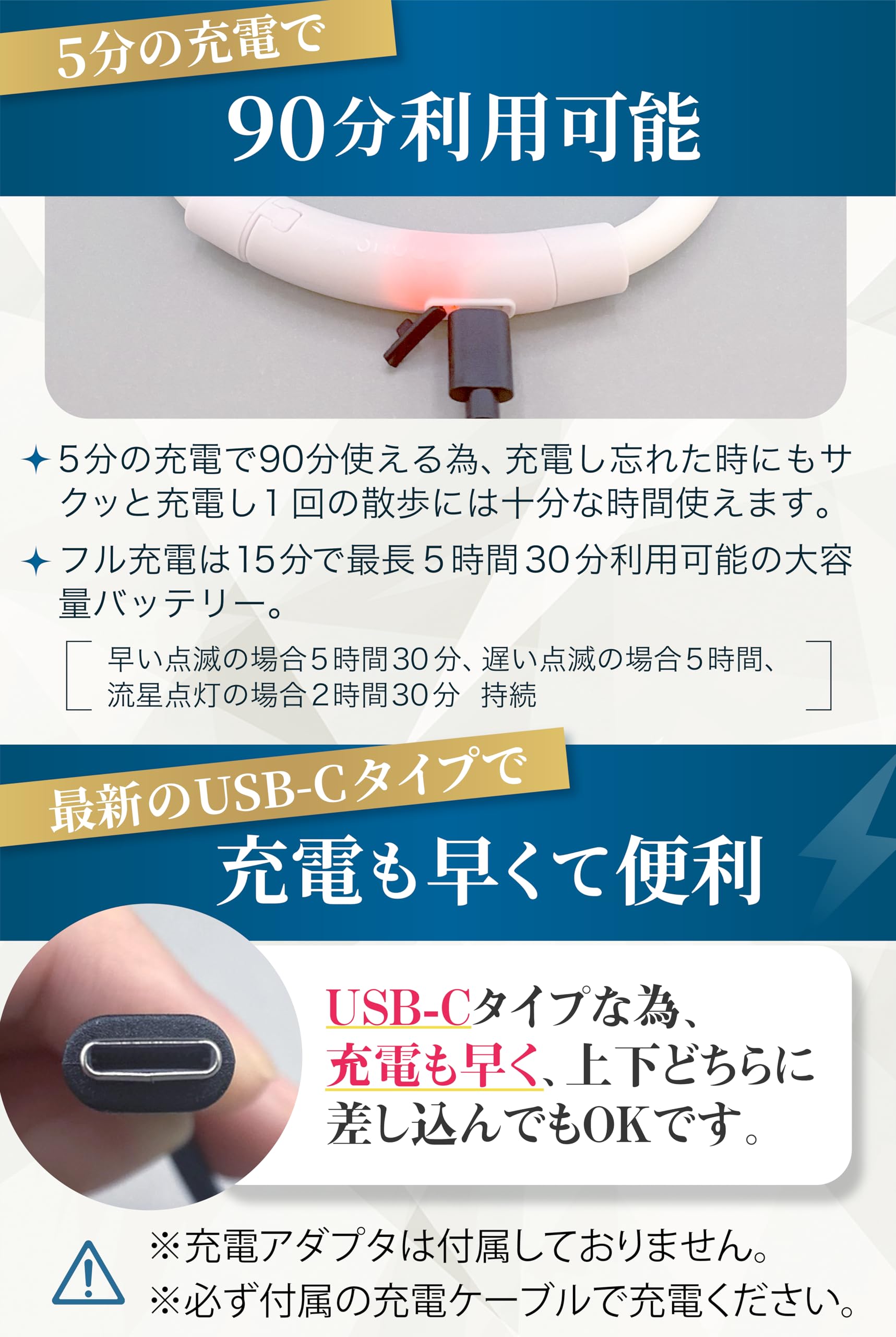 【5分の充電で最大90分使用可能】散歩前にさっさっと充電して十分な時間点灯するため、充電し忘れていた時も簡単に準備できます。