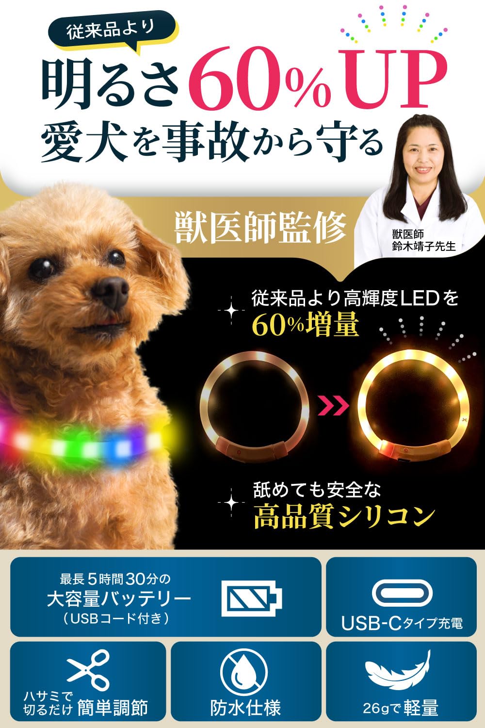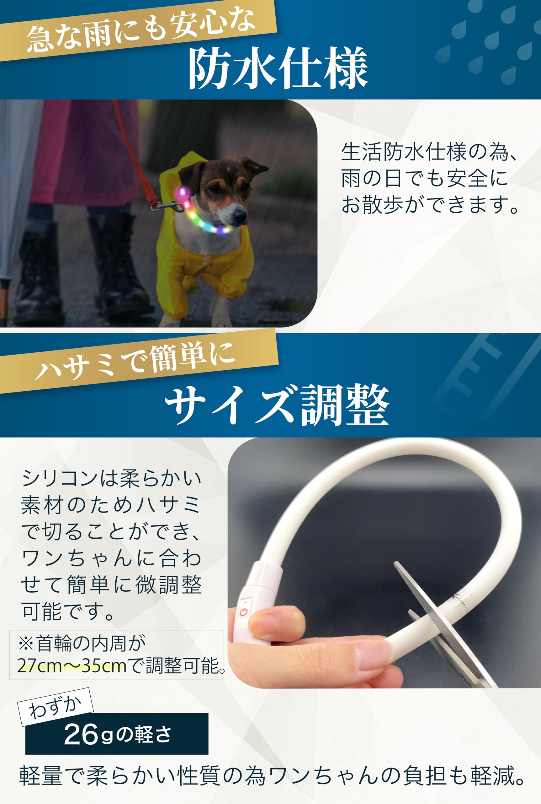 ※製造時期の違いにより、パッケージが異なる場合がございます。製品や仕様に変わりはございません。パッケージの選択は出来かねますのでご了承ください。 【光る首輪】鮮やかに光る首輪が、夜道や朝方、雨の日など薄暗い時のお散歩時に大切なワンちゃんを事故から守れます。