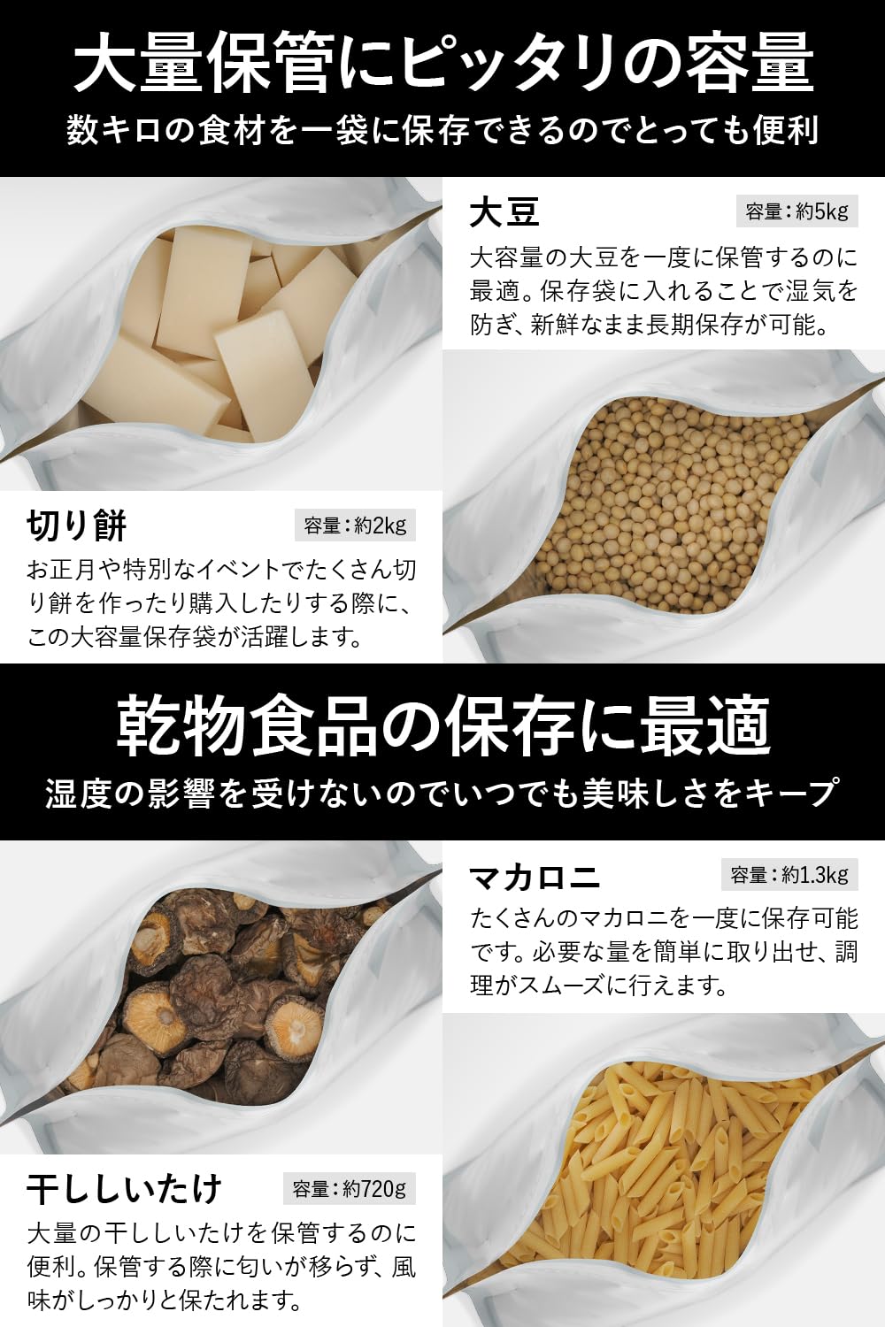 ストッカーとしても適しており、食パン袋としては2斤、お米なら約5kgを収納できるため、米びつや食パンケースの代わりにお使いいただけます。様々な食品を酸素・紫外線・湿度から守るので、大豆やコーヒー豆などの豆類、シリアルやパスタなどの主食の保管にも。