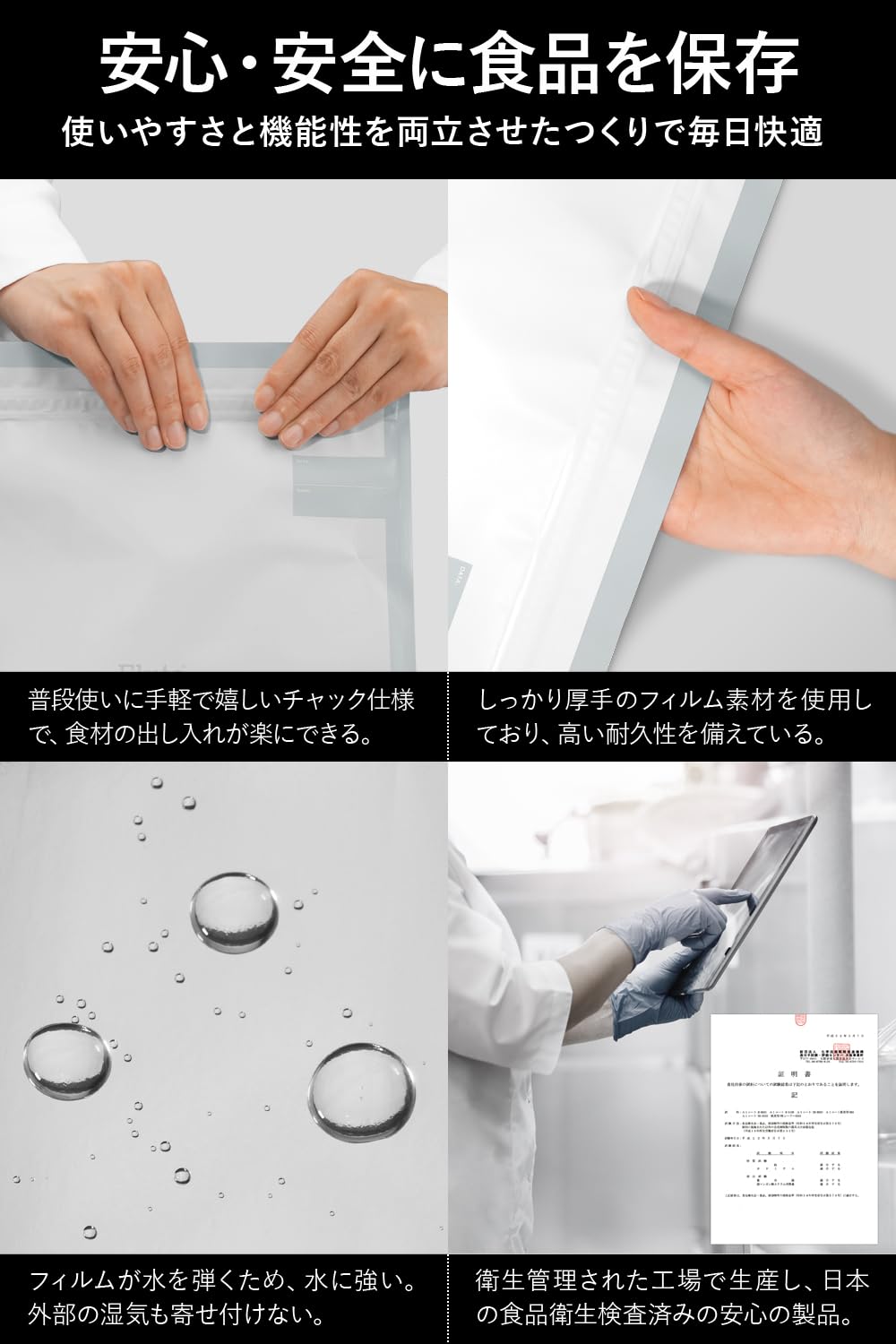 安心・安全に食品を保存できるチャック付き袋。厚手のフィルム素材を使用し、高い耐久性と機能性を両立。衛生管理された工場で生産され、日本の食品衛生検査をクリアした安心の保存袋です。普段使いに手軽で嬉しいチャック仕様で、日々の食材の出し入れが楽々。