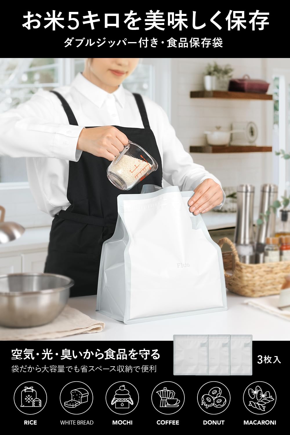 Fluto 食品保存袋 ダブルジッパー付き (お米 5kg 食パン 2斤用) 米袋 米びつ パン袋 食パン袋 白 ラージ 3枚