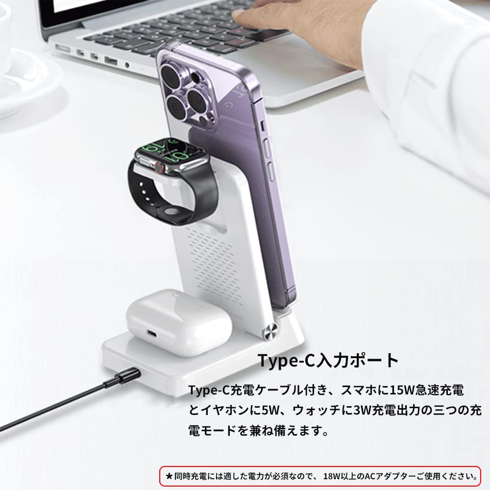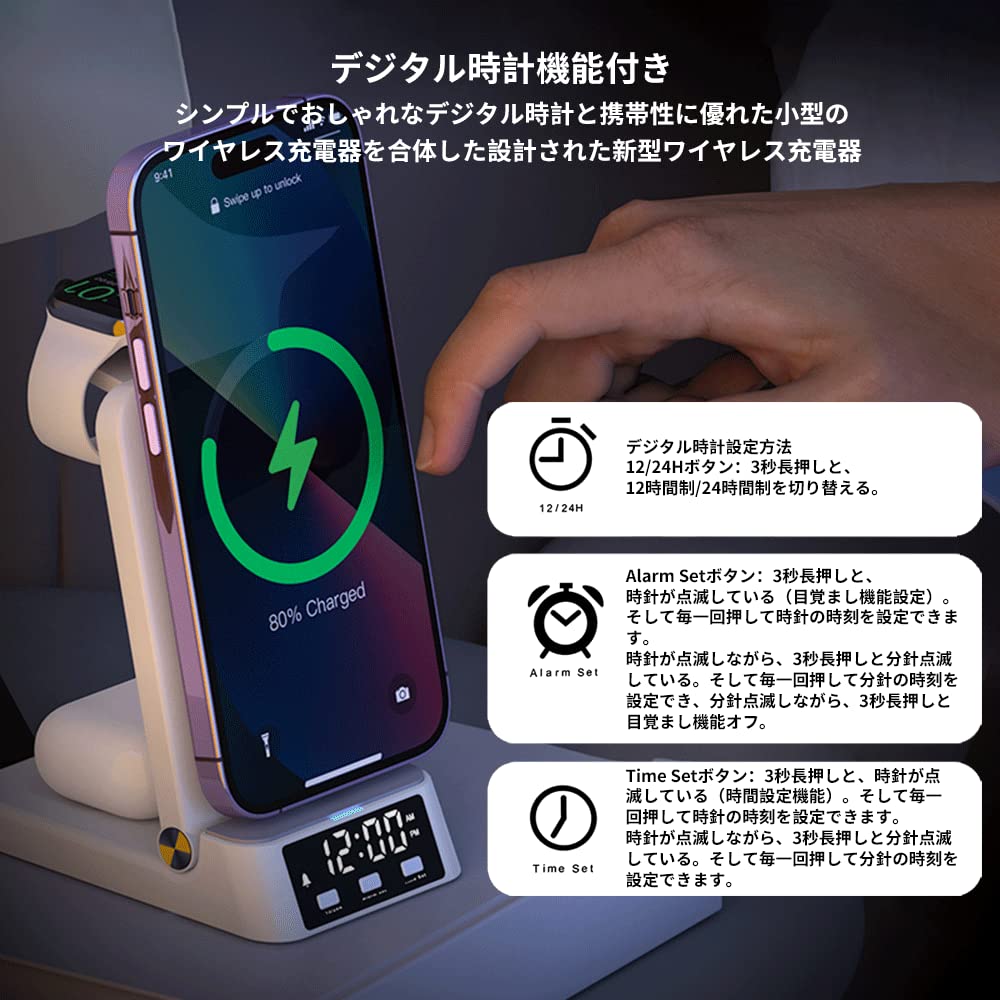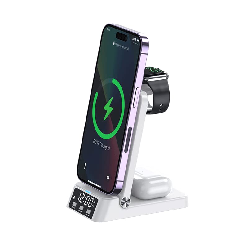 ワイヤレス充電器 3in 1 折り畳み式 15W急速充電 デジタル時計付き 置き時計 目覚まし Qi急速充電 iPhone充電器 充電スタンド 置くだけ充電 コンパクト 持ち運び iPhone/samsung/Sony/Galaxy/Apple Watch 他の機種対応 (ホワイト)