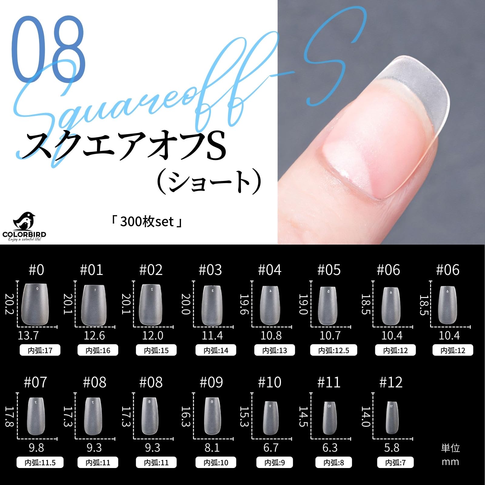 COLORBIRD ネイルチップ 超薄 ショート クリア サンディング 自然なフィット感 つけ爪 (スクエアオフS 300pcs)