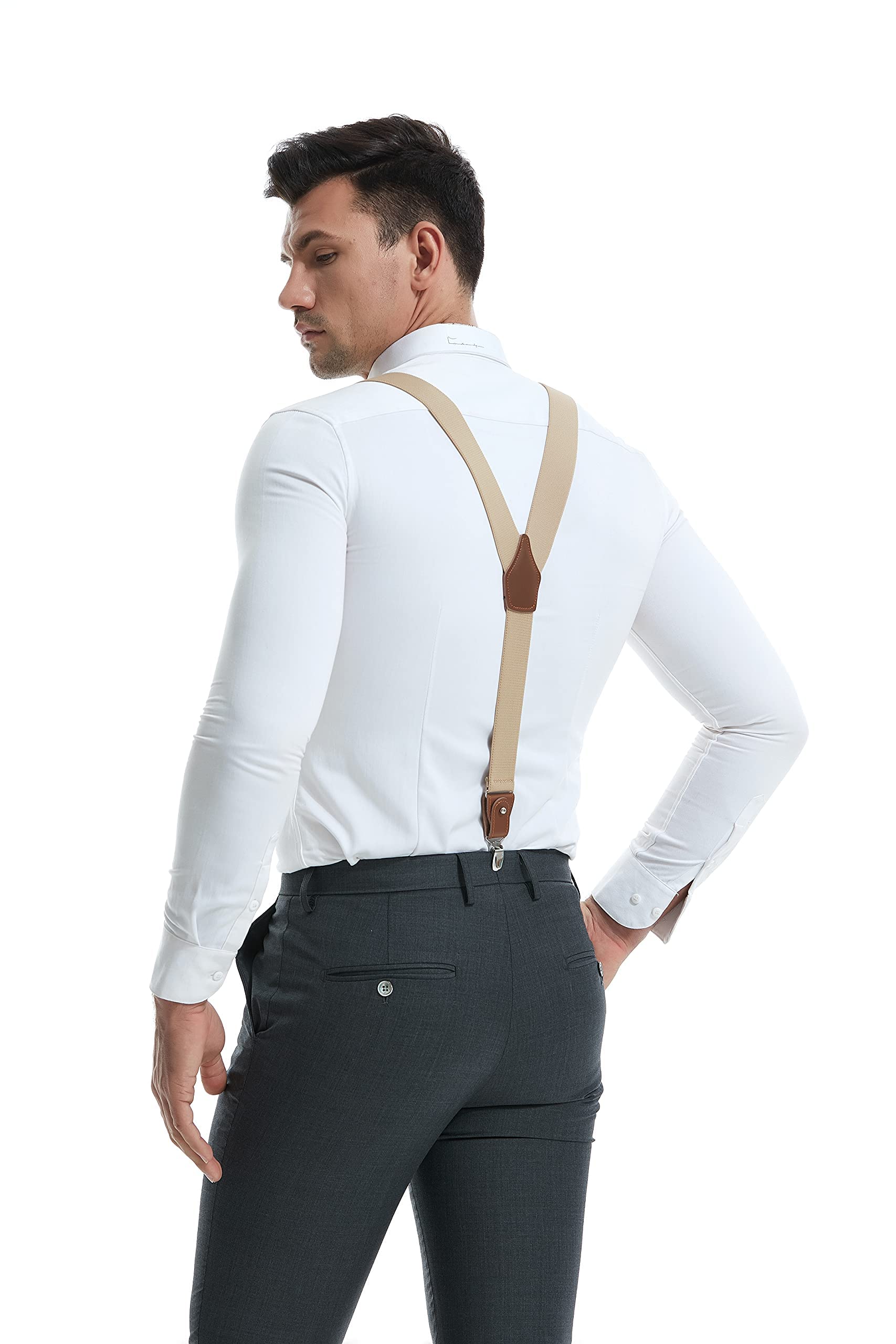 Yバック構造と本革クロスパッチ、本革ボタンアタッチメント、調節可能なボタンエンドサスペンダー、6つボタンが無料で付いています。