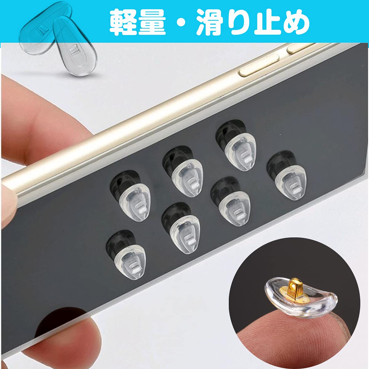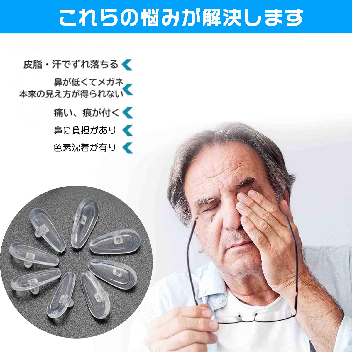 【たくさんの悩みが解消&エアクッション】鼻筋の形状に合わせて設計されている鼻パッドです。鼻にぴったりフィットできるので、汗でメガネが滑ってしまう方、鼻が低い方の悩み、長時間の仕事や運動、娯楽などでも対応できます。柔らかい、硬くならなく、変形しにくい、色素沈着を予防し、鼻の負担を軽減することができます。●眼鏡鼻パッドは従来の鼻パットと違い、中空構造で中にエアーが入っていて、軽くて衝撃を吸収でき、鼻への負担を大幅に減らします。通気性が良く、長時間の装着でも痛くなく掛け心地が快適します。従来品と違い、長期間ご使用いただけます。