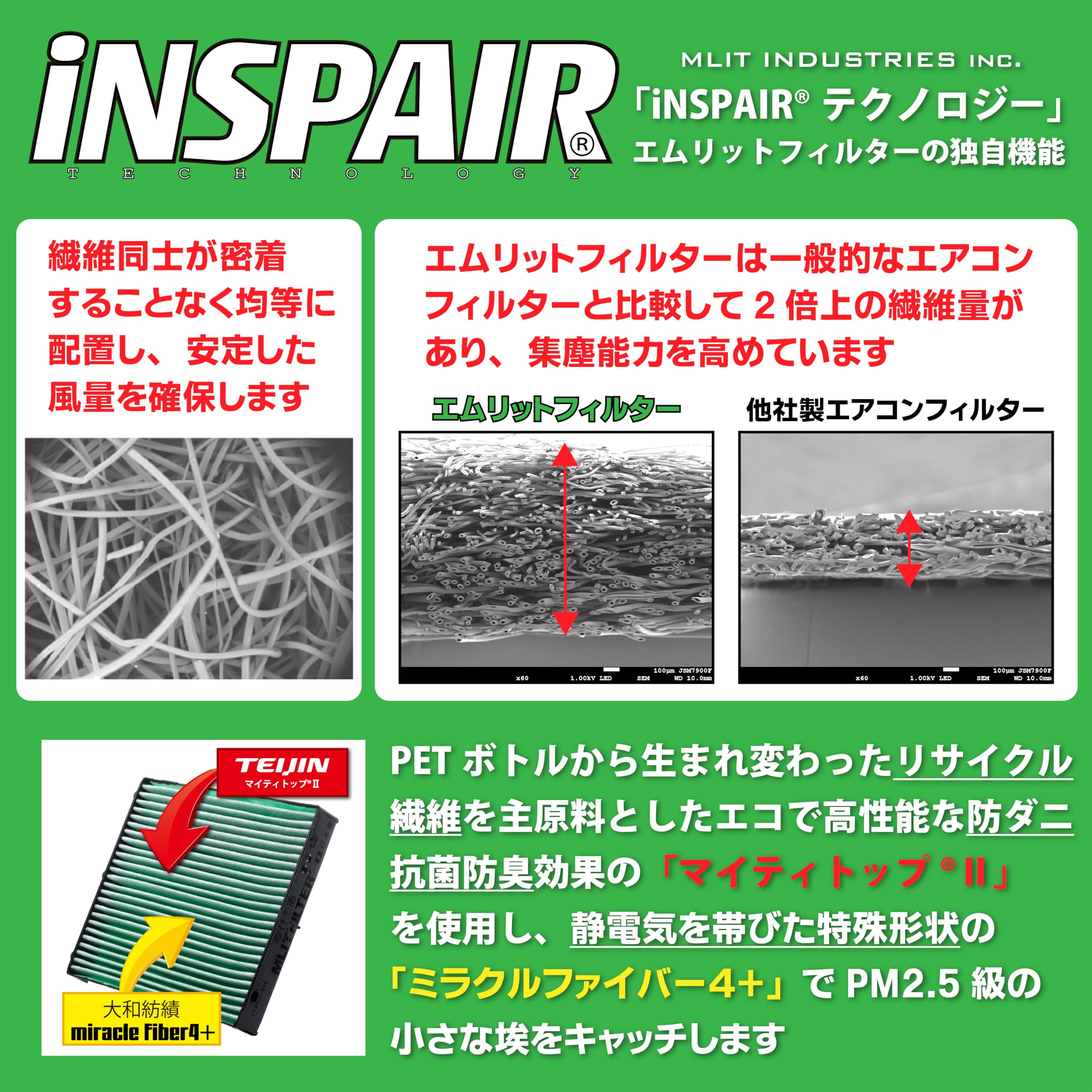 純正規格準拠 : エアコン専用フィルター INSPAIRテクノロジー (PM2.5吸着効率が飛躍的に向上)で純正品と変わらぬ風量を確保します。