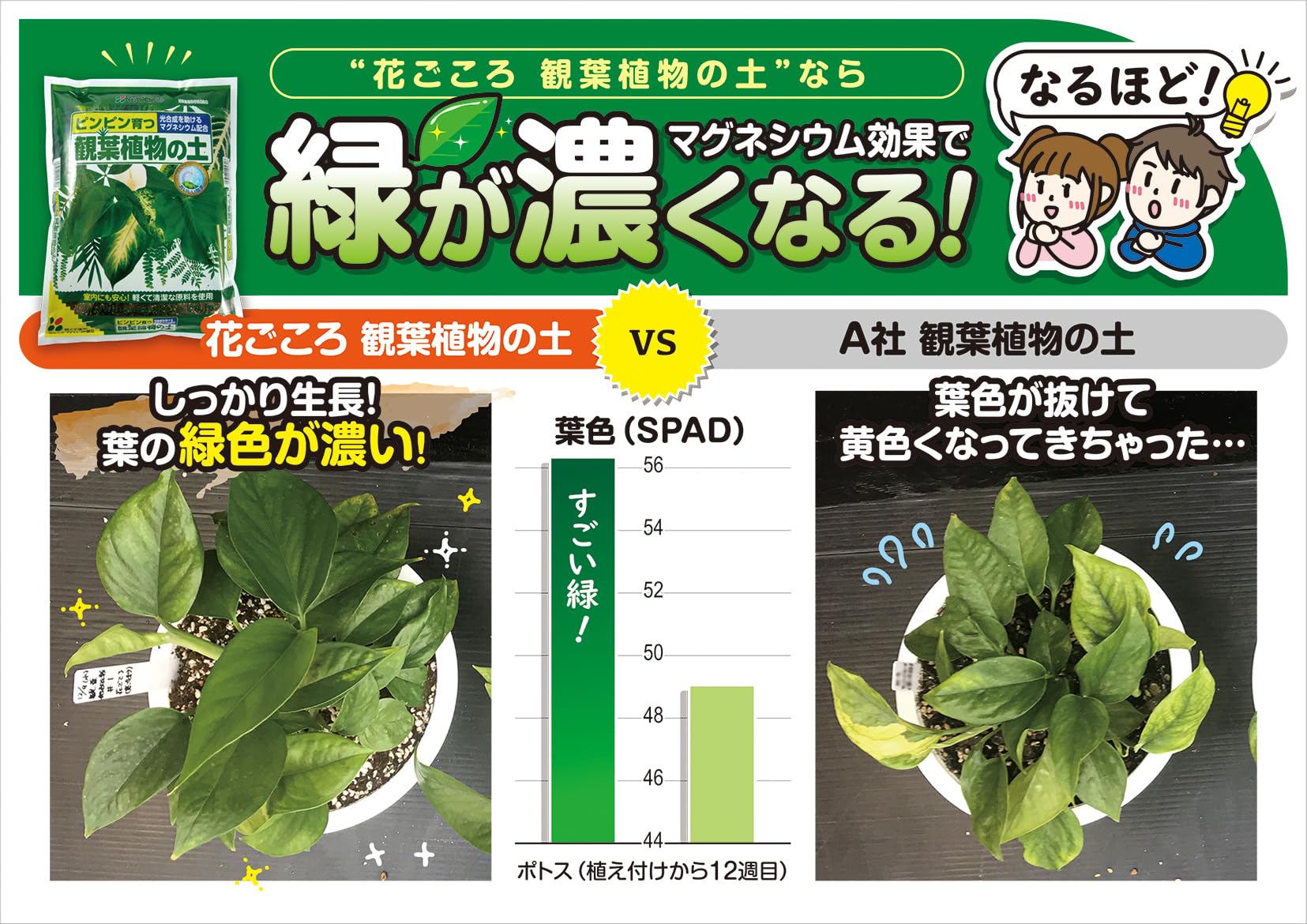 特長:葉の色が濃くなるマグネシウム配合、軽くて清潔な原料を使用しているので室内でも安心して使える