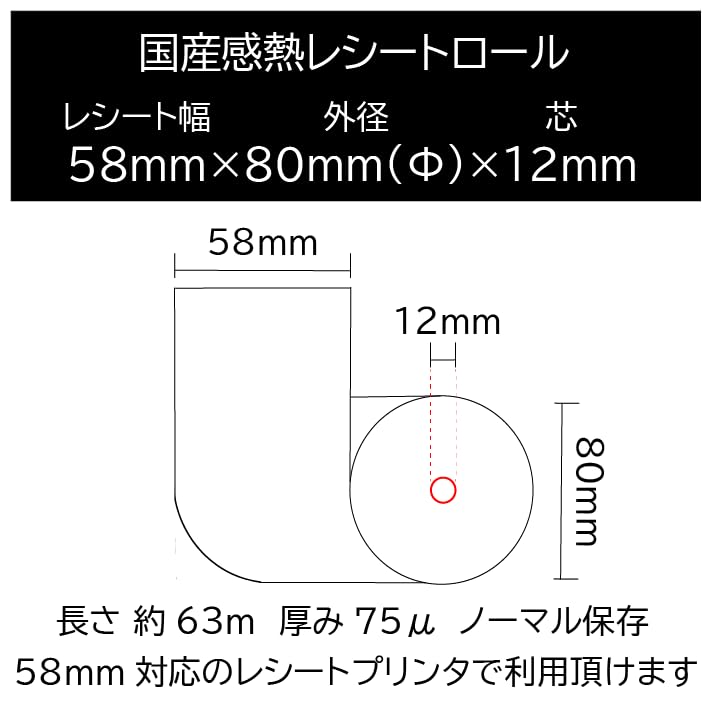 安心の国内産三菱製紙 幅 80mm x外形 80φ 芯径 12mm 長さ 約63m ノーマル保存 厚み75μ 5巻1パック 2パック10巻セットです。 カシオ シャープ 東芝TEC対応