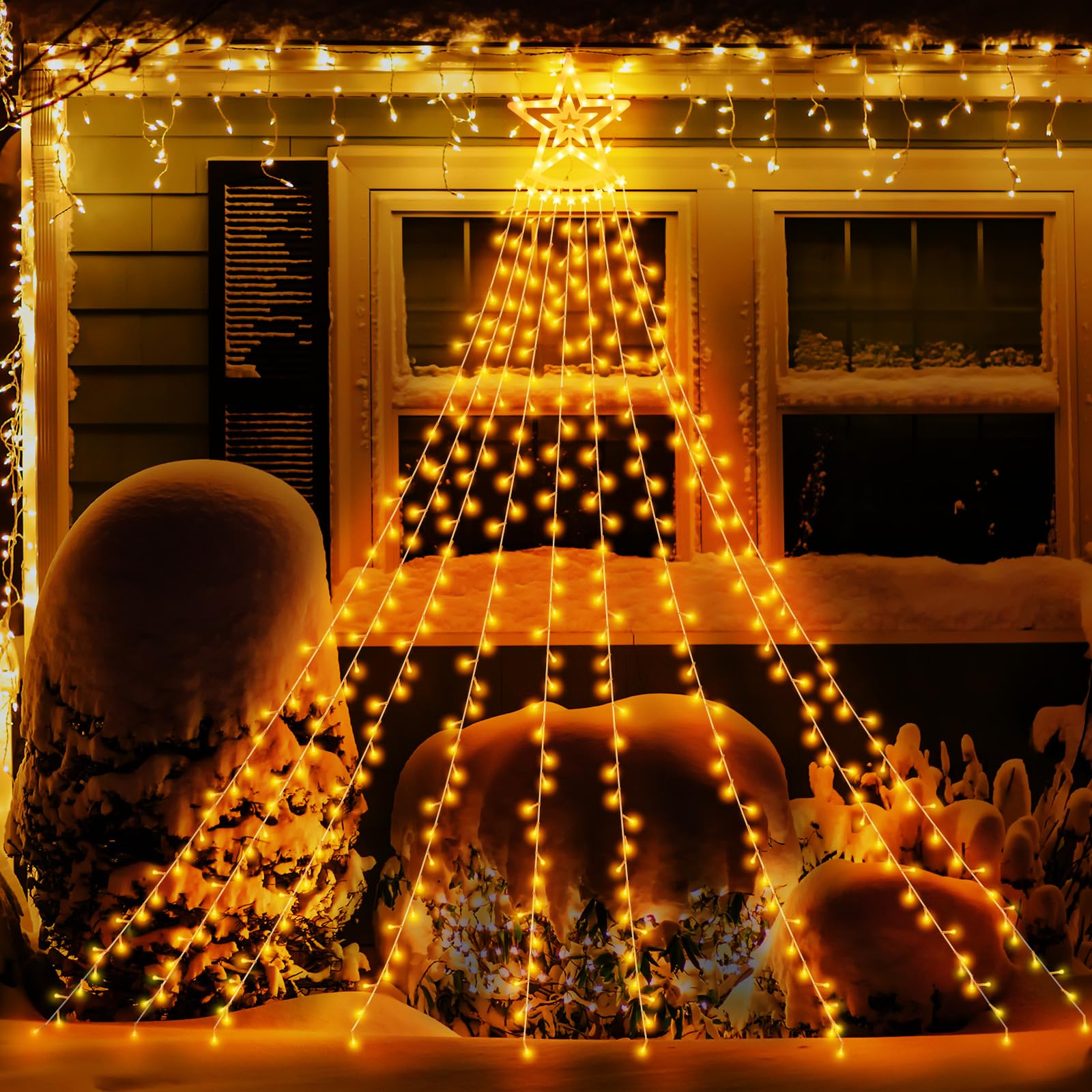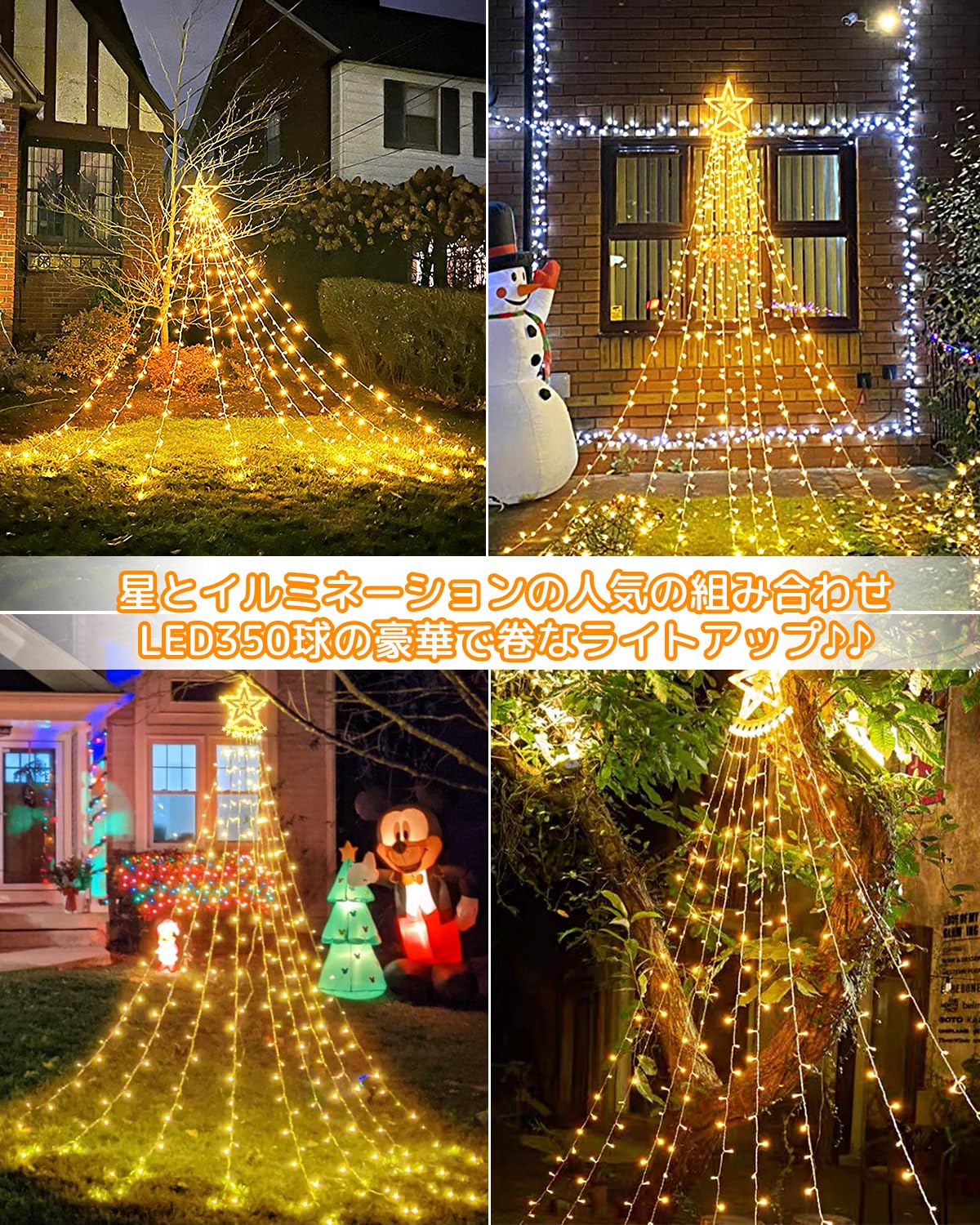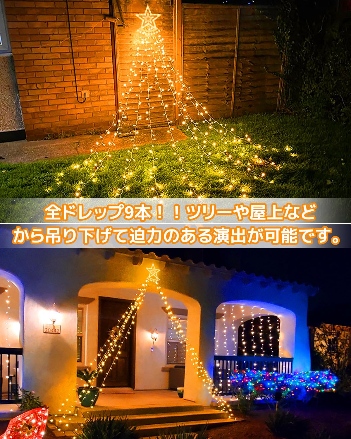 ✨【煌びやかなイルミネーションライト】全ドレップ9本!!ナイアガラの滝の様にボリュームたっぷりの光の波がダイナミックに流れ落ちます。350電球を搭載したLEDイルミネーションライトは長さ約3.5m*9本のライトなので、壁面はもちろん天井に取付けると天の川のような幻想的な演出もできます。直線状のイルミネーションなので曲げたり垂らしたり張ったりといった感じで様々な用途に活用でき最も汎用性の高いアイテムです。星とイルミネーションの人気の組み合わせのナイアガラライトは庭に1つ設置するだけで一気に華やぐ雰囲気に 直径32cmの星型モチーフの存在感は抜群で、庭に設置すると結構遠くから綺麗に見えます。クリスマスイルミネーションで迫力を手軽に残すならナイアガラライトをおすすめします。