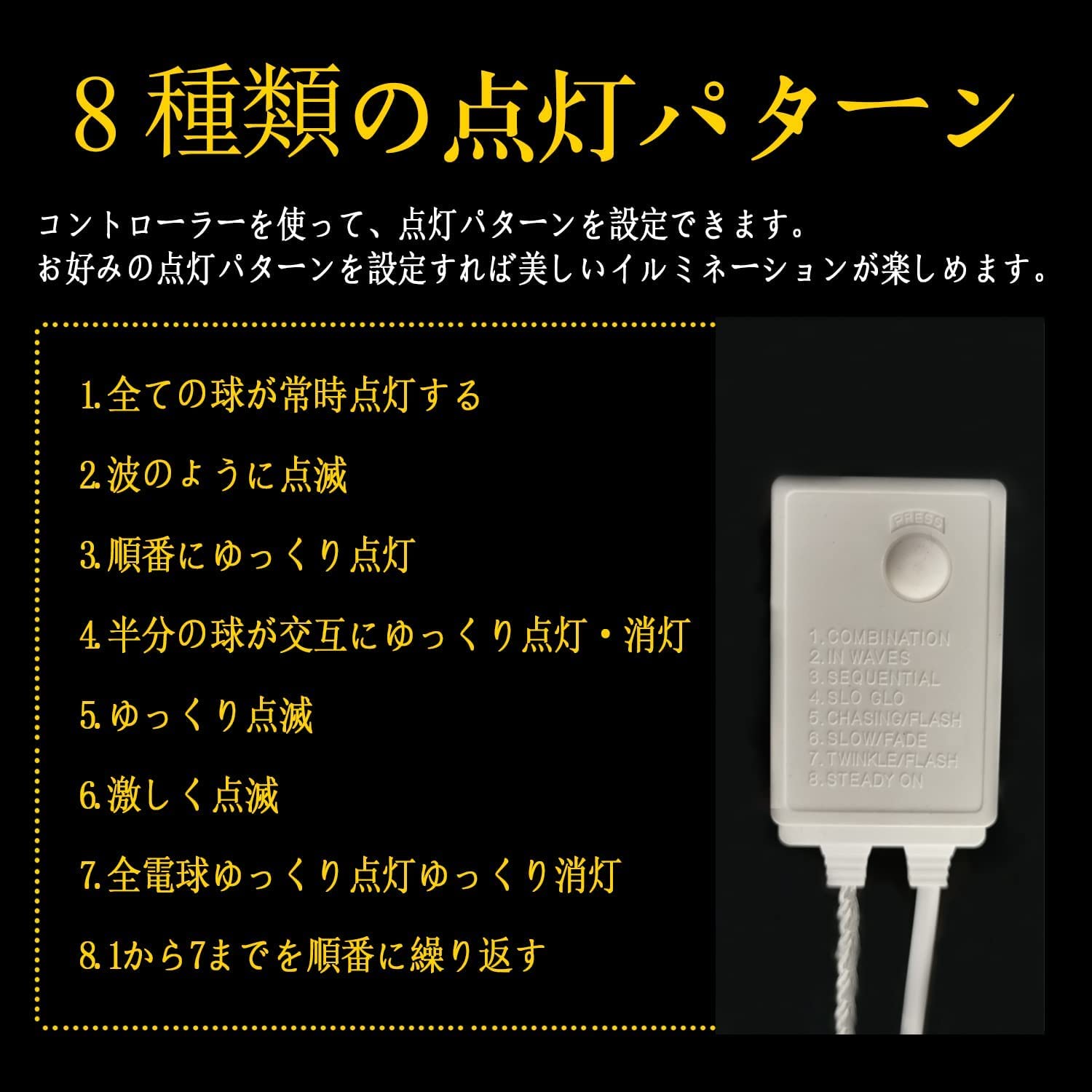 【8種類の点灯モード】付属コントローラーを使って、8種類の点灯パターンが設定できます。常時点灯や激しく点滅、ゆっくり点滅は人気の点灯モードです。お好みの点灯パターンを設定すれば美しいイルミネーションが楽しめます。
