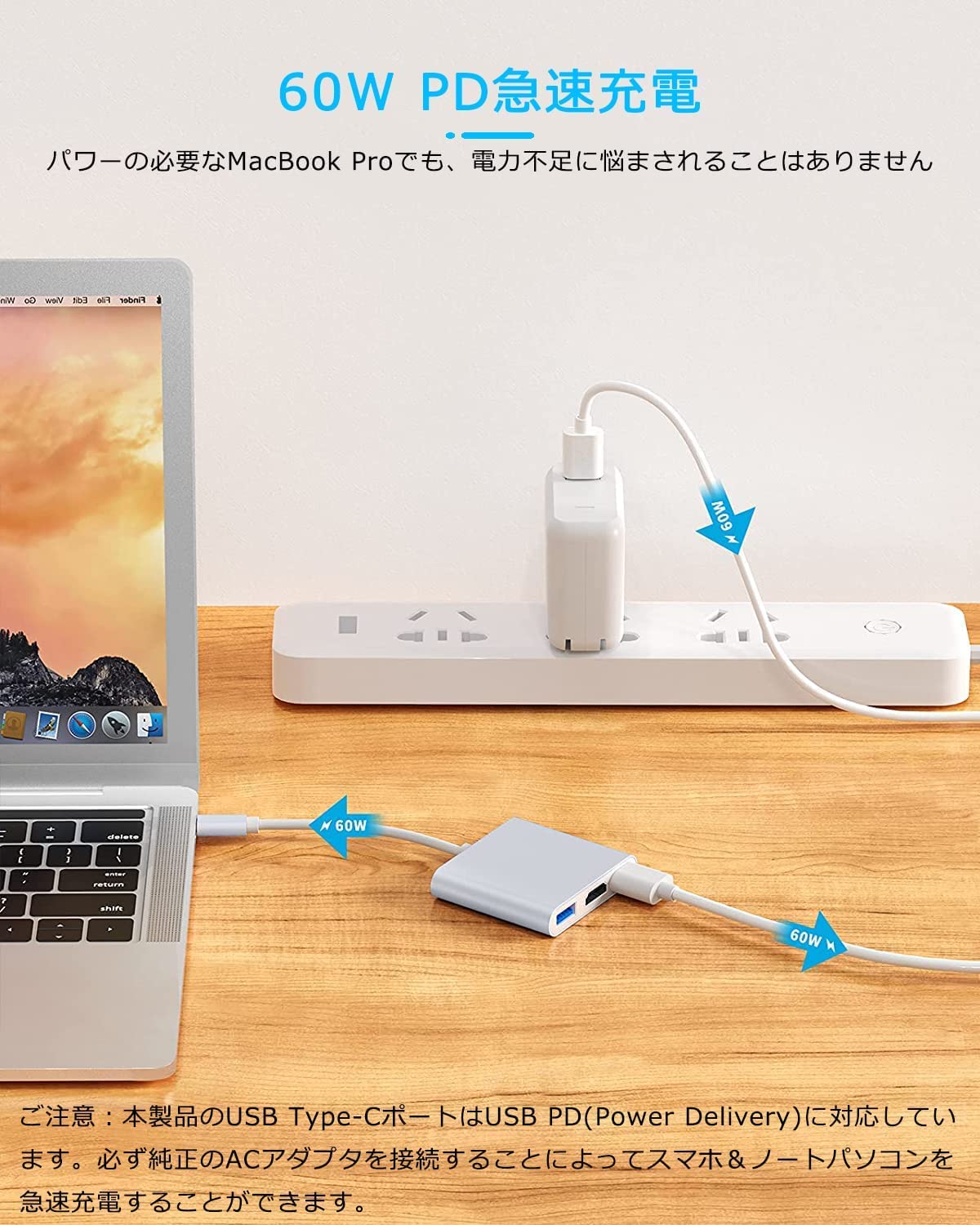 【PD急速充電】電源用USB Type-Cポートは最大60WのPDに対応。パワーの必要なMacBook Proでも、電力不足に悩まされることはありません。ほとんどのノートPCで過不足なく使うことができるでしょう。パソコンを充電しつつ作業が行えます。(ご注意:1. 電源用USB Type-Cポートは映像出力やデータ転送には非対応です。2. 本製品のUSB Type-CポートはUSB PD(Power Delivery)に対応しています。必ず純正のACアダプタを接続することによってスマホ&ノートパソコンを急速充電することができます。)