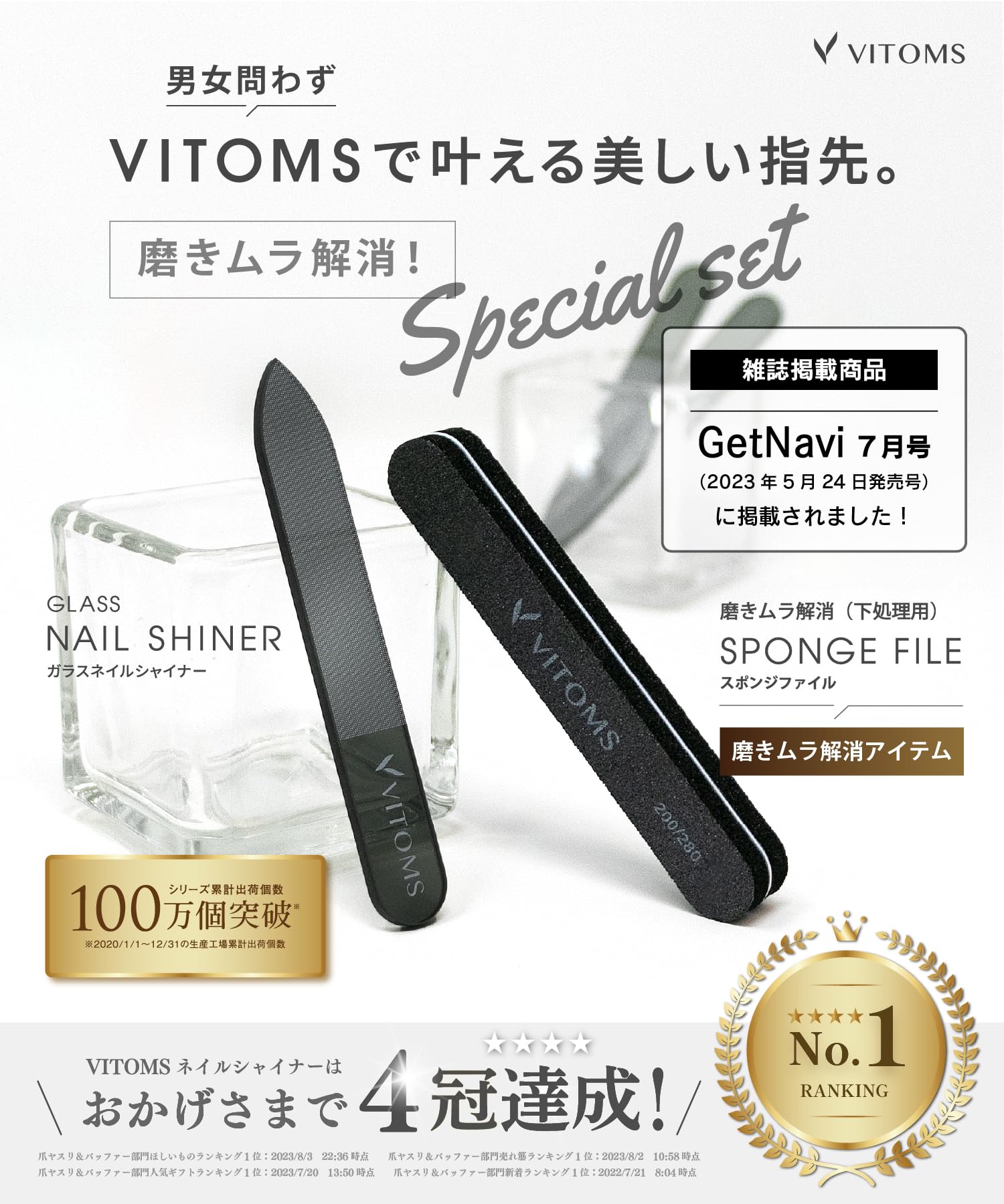 【プロネイリスト推薦】[VITOMS ネイルシャイナー(解説動画付)] こだわり仕様のつめみがき・つめやすり。キメの細かいヤスリ目が、爪の表面にワックスがけしたようなツルツル・ピカピカの輝きを与えます。爪みがきとしてだけでなく、爪の先端を整えるなど爪ヤスリとしてもご利用いただけます。/品質、デザイン、ケースの細部までこだわりました。プレゼントやギフトにもピッタリなパッケージでお届けいたします。※本商品は雑貨です。