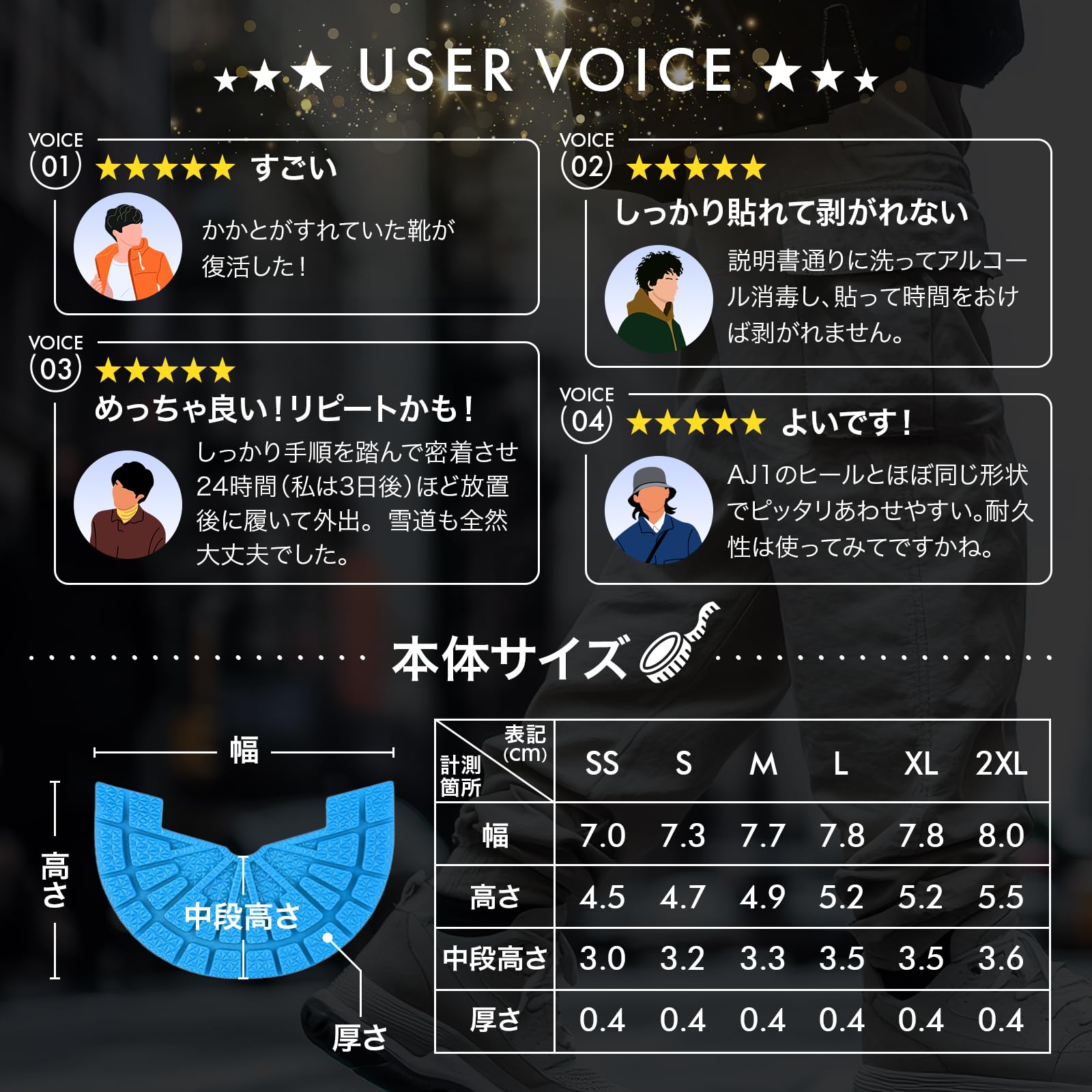 ️取り付け方法 ①ヒール部分の汚れを拭き取る。 ②アルコールなどで拭き上げる※この処理を怠りますと剥がれの原因となります。 ③乾燥後ヒール部分に合わせて貼り付ける。 ④中心から空気を抜くように手でしっかりと抑える。⑤ドライヤーで両面テープ部分を温め、冷やす。 ⑥一度足を入れ、1〜2分ほどかかとにしっかりと垂直に体重をかける。 ⑦24時間ほど置き、完成です! ※より強固に接着したい場合は市販の接着剤を 貼り付け後、靴底と本商品の隙間に塗布しご使用ください。