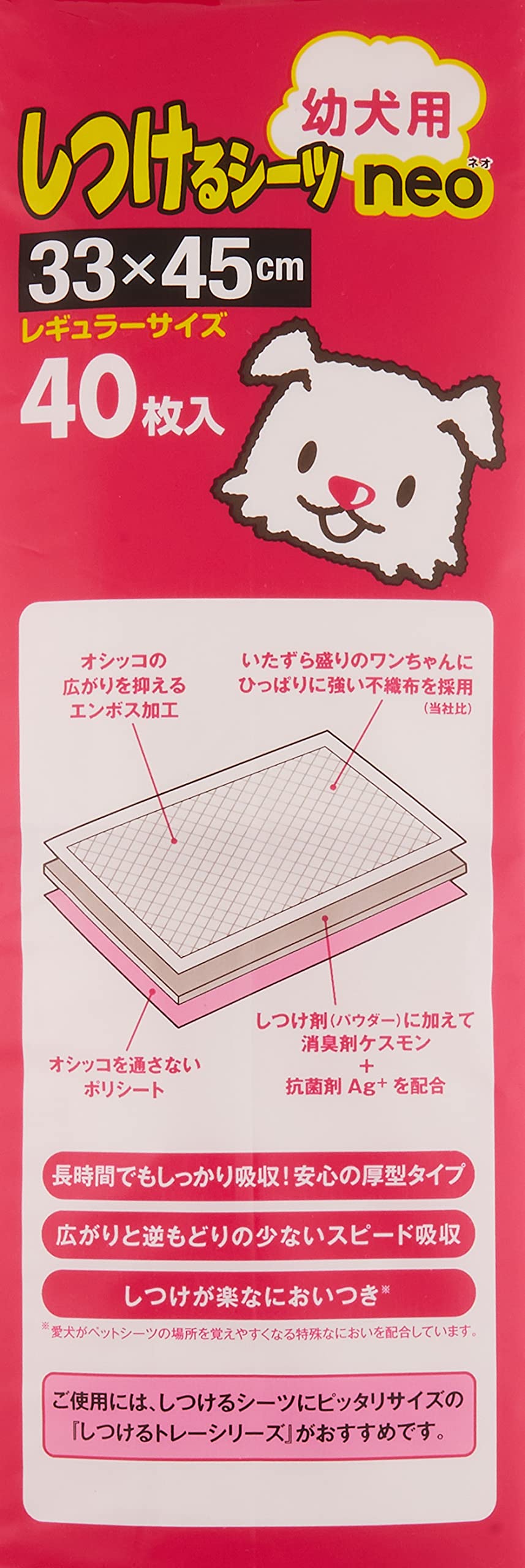 しつけるシーツ幼犬用neoは、幼犬に最適なしつけ機能強化しました。 ・引っかきに強い不織布を採用しているので、幼犬のいたずらにも安心! ・消臭剤ケスモン、抗菌効果のAg+を加えて更に消臭効果アップ! ・しっかり厚型タイプで長時間でも安心の吸水力! ・おしっこを通さないポリシートとオシッコの広がりを抑えるエンボス加工 ・おしっこの色がわかりやすい白色吸水シート ・可愛いピンク色のバックフィルムはおしっこを通さず滑りにくい加工付き 【しつけるトイレのとは】 1、ペットにしかわからないニオイでペットシーツへ誘導します。 2、繰り返しにおいを覚えることでトイレのしつけがしっかりと定着します。