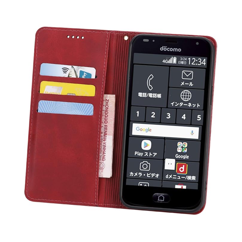 らくらくスマートフォン me F-01L / F-42A ケース 手帳型 カバー PUレザー カード収納 財布型 耐衝撃 ケース マグネット スタンド機能付き 5色 (レッド)
