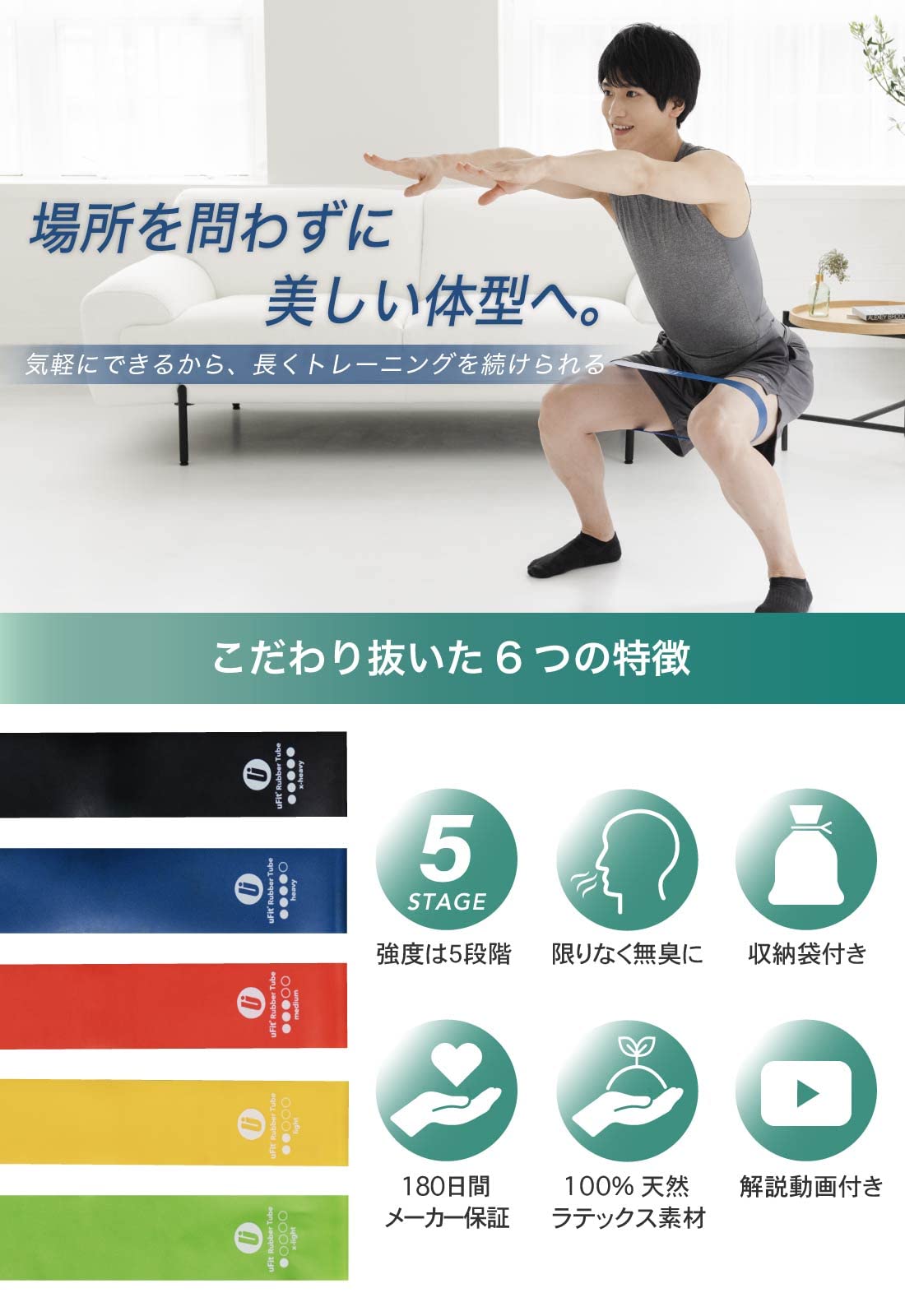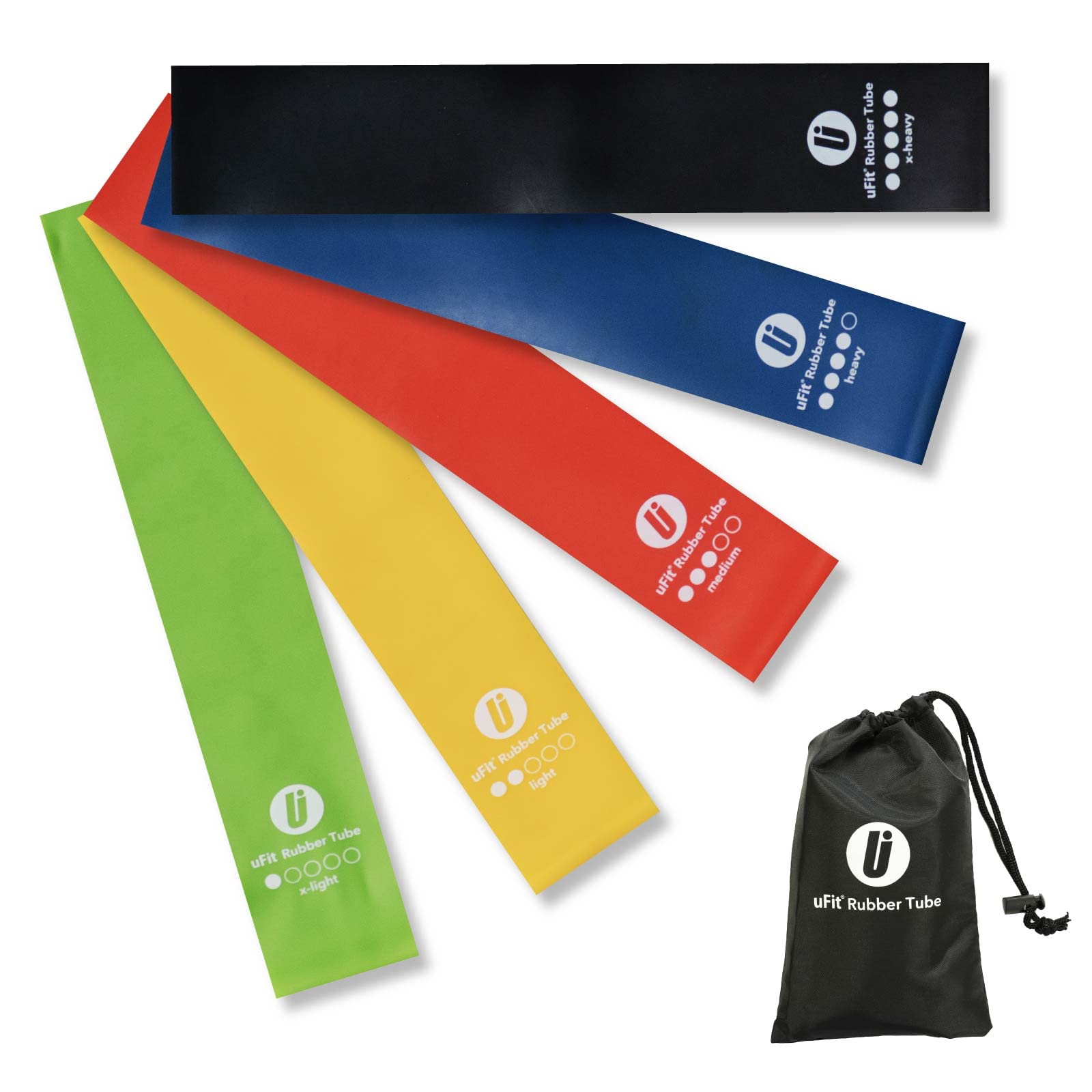 uFit Rubber Tube ゴムチューブ 筋トレ 強度別5本セット プロアスリート 水谷隼 愛用 天然ゴム 臭くない 収納袋 使い方動画 トレーニング フィットネス エクササイズ (1)
