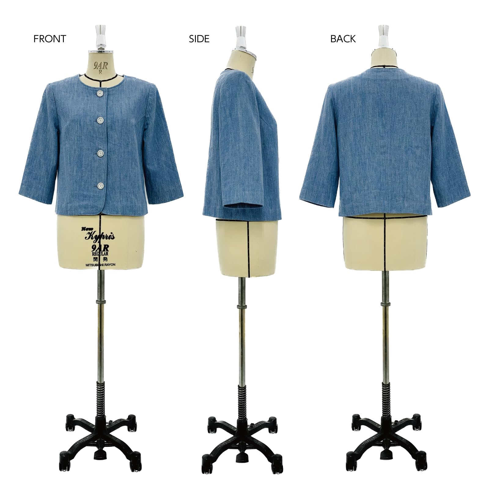 上品で女性らしいノーカラージャケット。 裏地のパターンつきで、Aは長袖・ポケットつき、Bは7分袖。