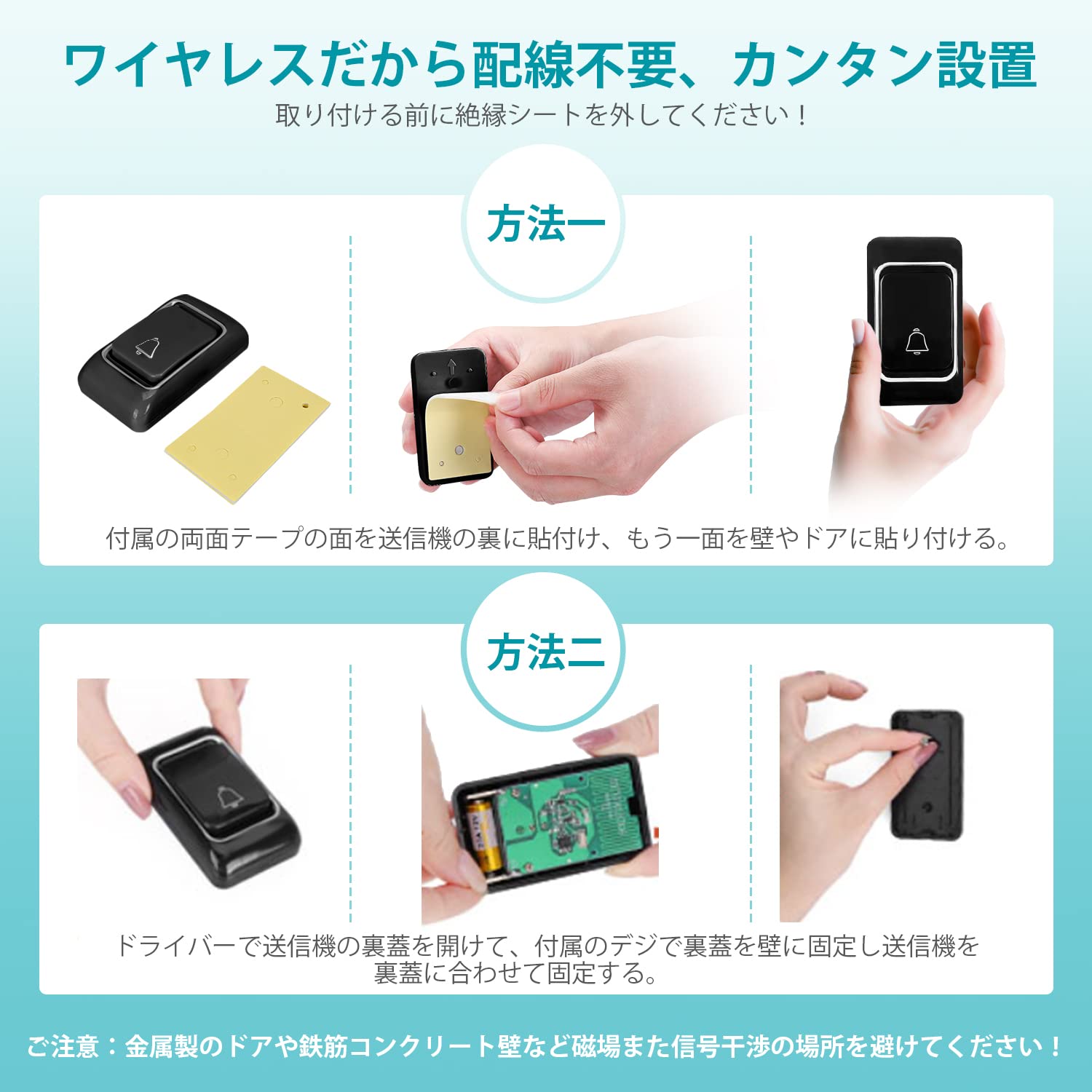 【使用簡単&省エネ設計】無線チャイムで複雑な配線工事が不要です。電池交換の不便もなく、ドアチャイム受信機はコンセントに差し込むだけで、送信機をドアフレームに固定し(両面テープでの接着可能)ボタンを押すだけでチャイムが流れます。設置が簡単で手軽です。このチャイムは超低消費電力設計を採用しとり、省エネと持続利用に優れています。