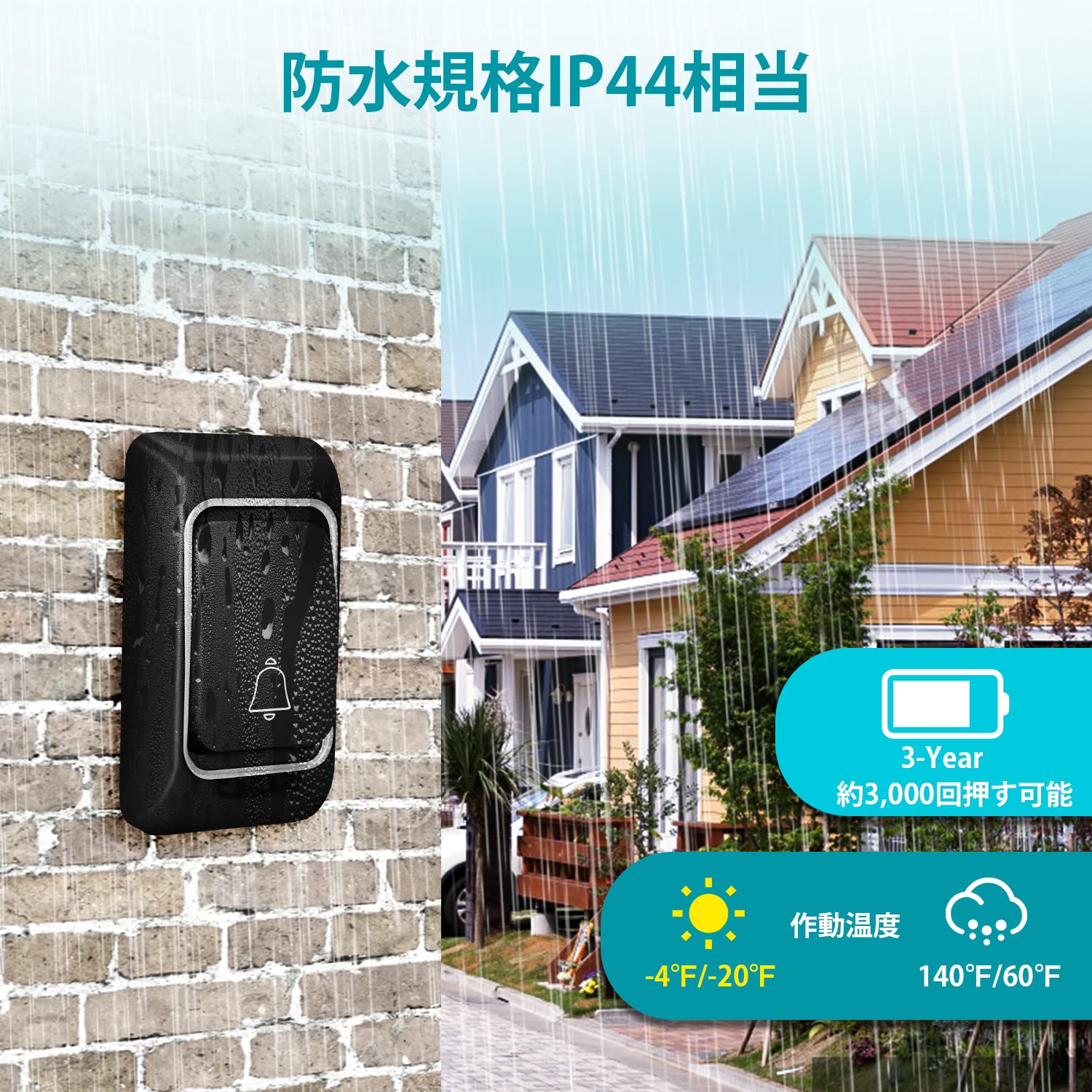 【増設可能&IP44防水防塵】この呼び出しチャイムセットは固定IDコードにより、電波の妨害や混信などの心配はありません。多送信機や受信機は何台でも増設可能です。高品質ABS材質を採用し、IP44レベル防水仕様で、屋外や風呂場でも使用でき、雨の日でも心配ありません。ご注意:水に浸けて使用することや直接雨がかかる場所のご使用はお避けください。