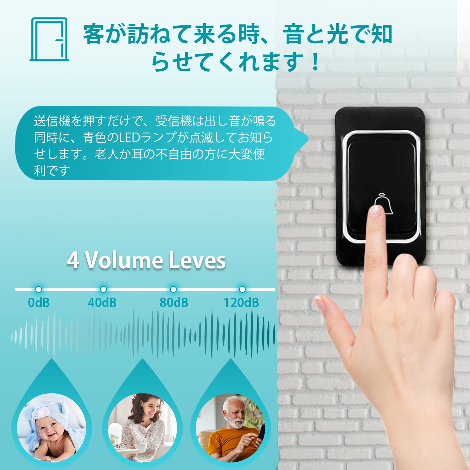 【4段階音量調整&多彩なメロディック】36種類の音楽が選択可能で、音楽選択ボタンを押して、自由に好きな音楽を選択できす。音量ポタンを押して0~120dBまで4段階に音量調整可能で、訪問者がチャイムを押すと、呼出し音が鳴ると同時に、LEDランプが点滅してお知らせします。耳の不自由な方にも安心ご利用いただけます。光と音でお知らせ、お互いに便利なワイヤレスチャイム、緊急の時もすぐに気づけて安心できます。