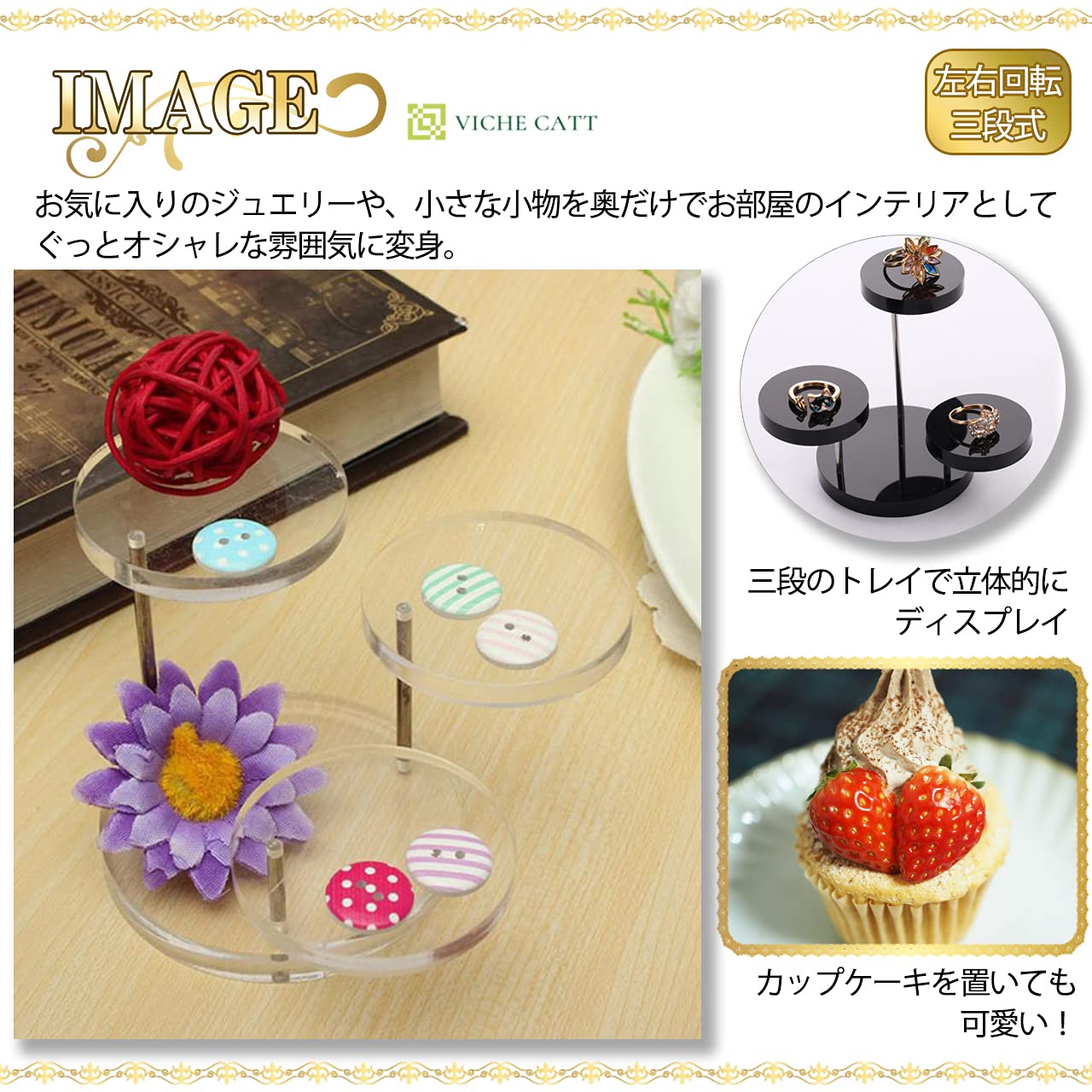 透明感と高級感が漂うクリアーとブラックの天板カラーをご用意しました。(同色2個セット) 三段の可動式トレーを動かせば自分好みに配置ができる仕組みです。 トレーの固定は緩すぎず、一度設定してしまえば勝手に回ってしまう事もありません。(※円の台は、稼働しますが高さは固定されています。) 動かす際にはトレーの割れやポールの歪みに注意し、無理な力を掛けなければ”キュキュキュ…”っと簡単に回転させられます。 イヤリング・ピアス・腕時計などの装飾品や、小さなコレクショングッズを立体的に魅せて収納できる商品です。