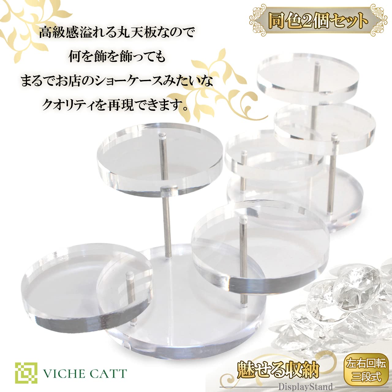丈夫なアクリル素材で出来た便利な三層回転式ジュエリースタンドです。 すでに組み立てられた状態でおうちに届くので、あとは飾りたい場所にセッティングするだけでご使用いただけます。 つややかなアクリル板を使用しているのでアクセサリーなどの装飾品はもちろんのこと、フィギュアやちょっとした小物も置くだけで高級感漂う雰囲気でディスプレイすることが出来ます。 お手入れも簡単なので、埃が付いたらサッと一拭き。水洗いも可能です。 実際にお店での展示ツールとしてもご使用いただけ、撮影用にも重宝できる立体的なデザインになっております。