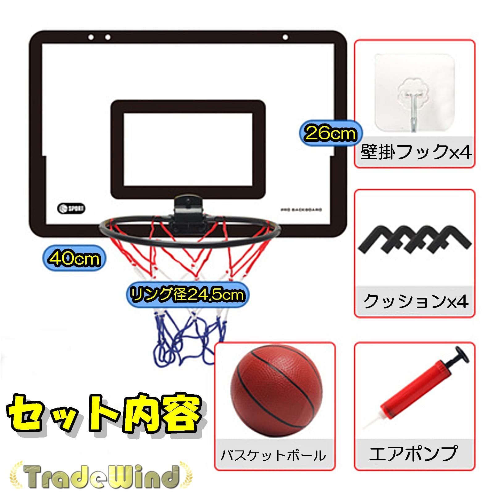 【セット内容】バスケットゴール、ゴールネット、ボール、エアポンプ、シールタイプフック×4、傷騒音防止クッション×4【サイズ】ゴール板:40×26cm ゴールリング:24cm ボール:15-16cm