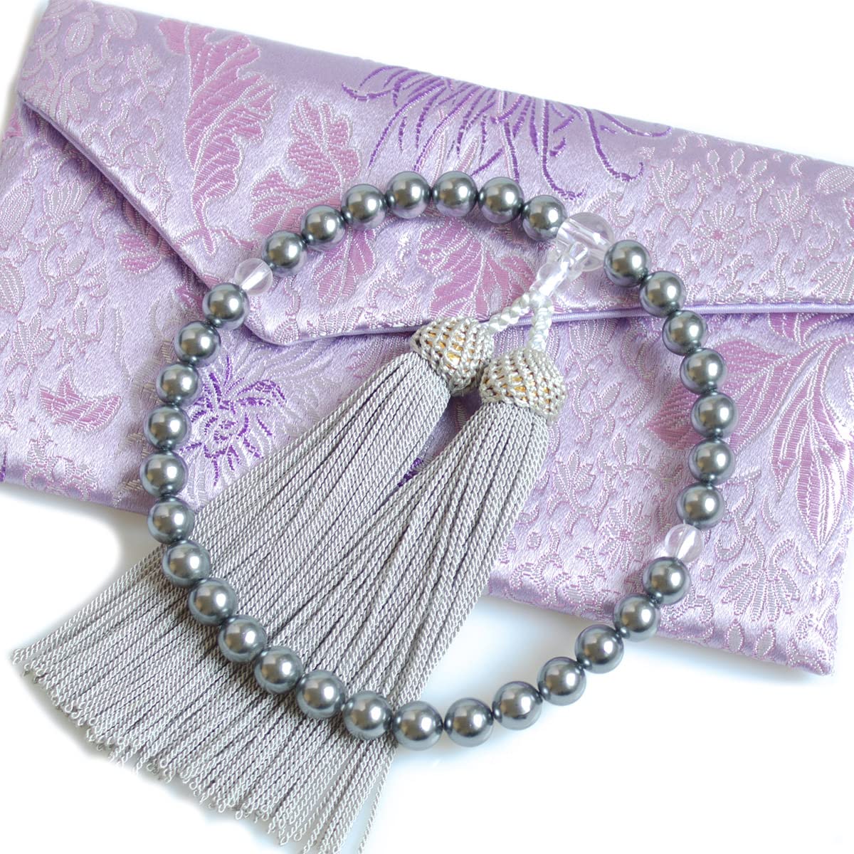 数珠 女性用 花珠 貝パール マグネット式 数珠袋付き 黒貝パール
