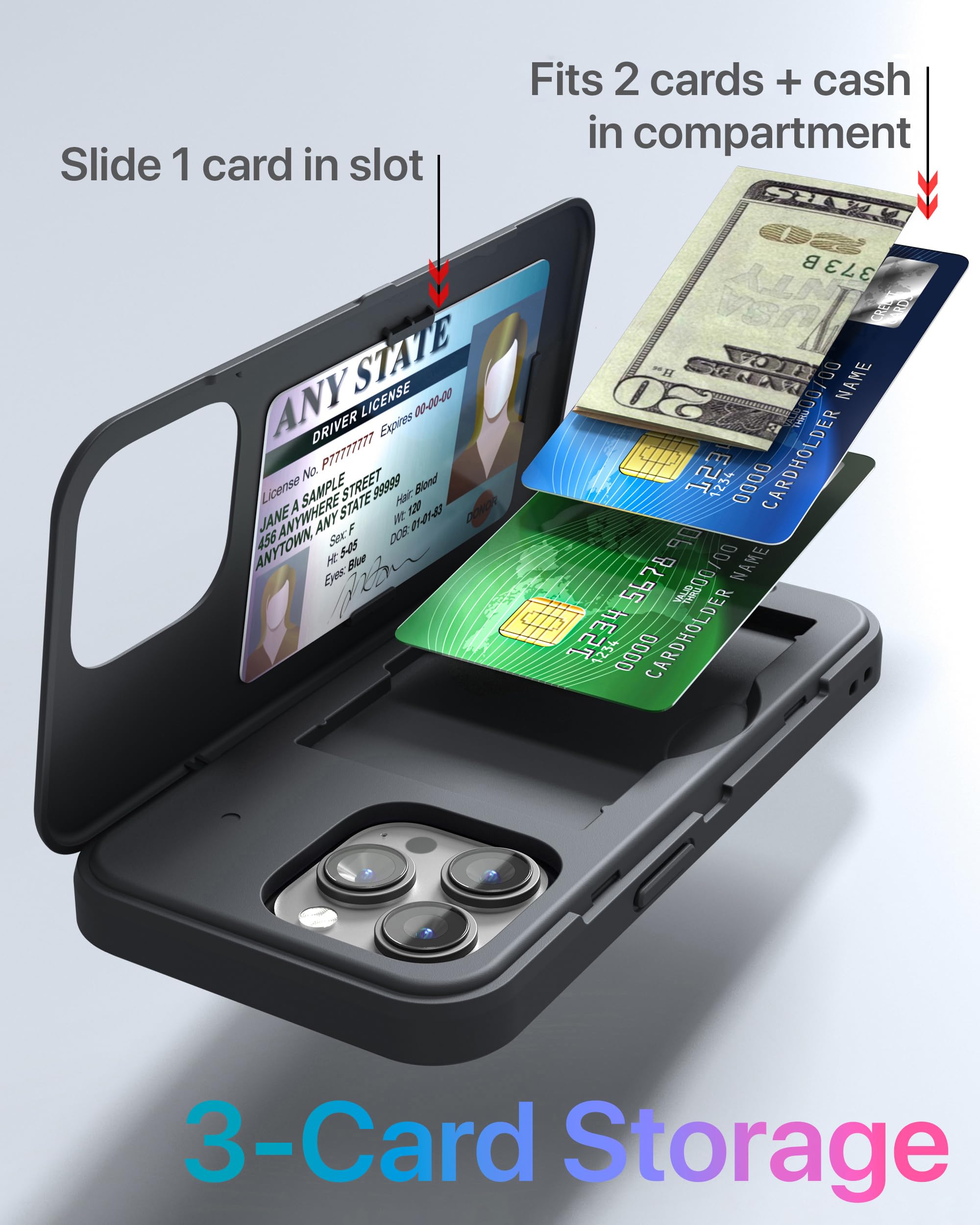 TORU CX SLIM iPhone 15 Pro ケース カード背面収納 | 隠れた 手帳型 3枚 カード | 2重構造 耐衝撃 IC カード ポケット パススリム カバー (ストラップ ミラー 含ま) - ブラック