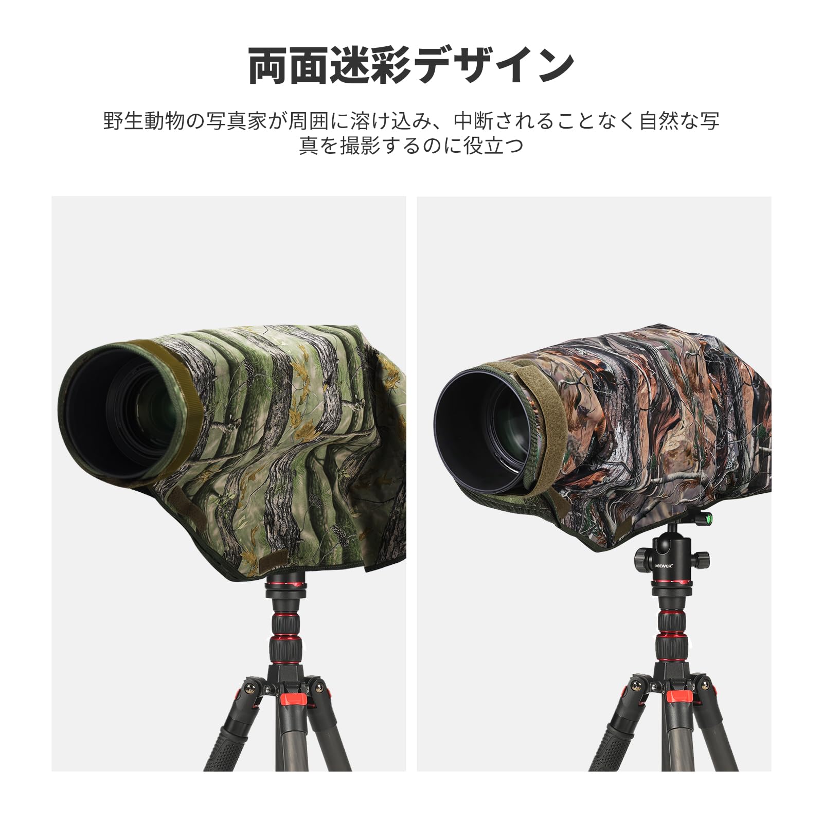 【両面迷彩デザイン】カメラレンズ迷彩レインカバーは野生動物カメラマンが周囲に溶け込み、中断されることなく自然な撮影ができるようにサポートします。リバーシブルデザインなので、天候の変化にも素早く対応でき、自然な瞬間を捉えることができます。