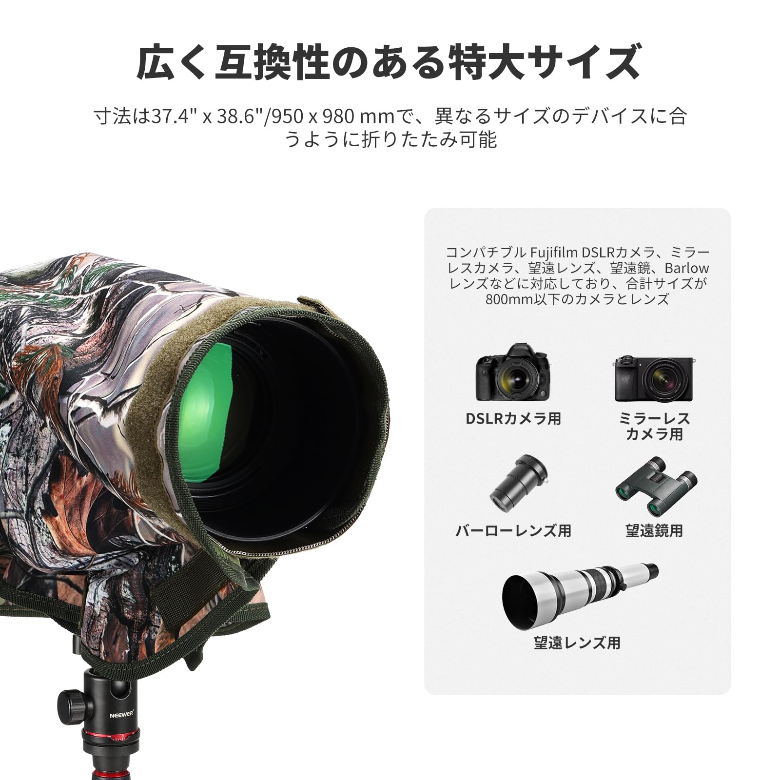 【多用途&特大サイズ】レインカバーは37.4"×38.6"/950×980mmサイズで、異なるサイズのデバイス用に折りたたむことができます。コンパチブル Fujifilm DLSRカメラ、ミラーレスカメラ、望遠レンズ、望遠鏡、バーローレンズなど、合計サイズが 800mm以下のカメラとレンズに適しています。