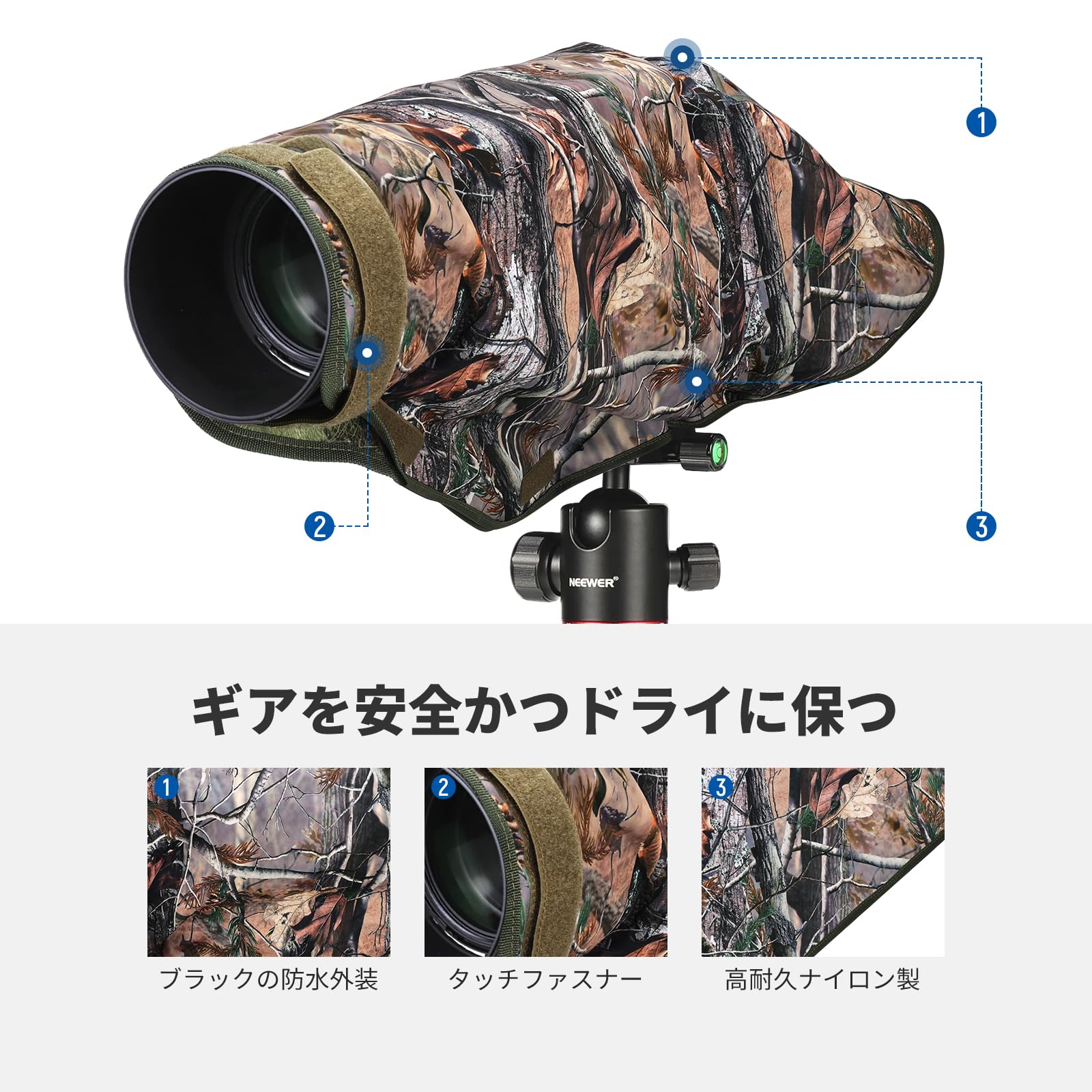 NEEWER カメラレインカバー XL 大型防水レインコート 汎用カメラデジタル一眼レフ/ミラーレスに適用 最大800mmまで 両面迷彩グリーンナイロン 防水 屋外撮影 保護カバー 雨対策 PB019
