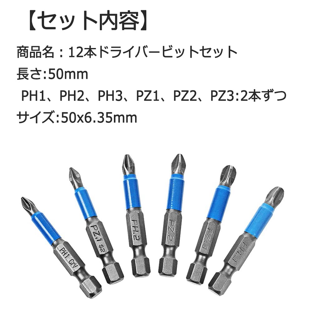 【セット内容】ドライバービットセットには、長さ50mmのドライバービットがそれぞれ12本含まれています。 PH1、PH2、PH3、PZ1、PZ2、PZ3は2本ずつです。サイズは50x6.35mmです。