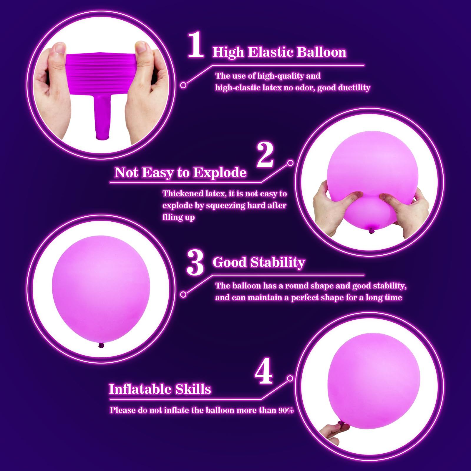 注意:ネオンカラーの風船は、UVブラックライト反応なしでは暗闇で光りません。