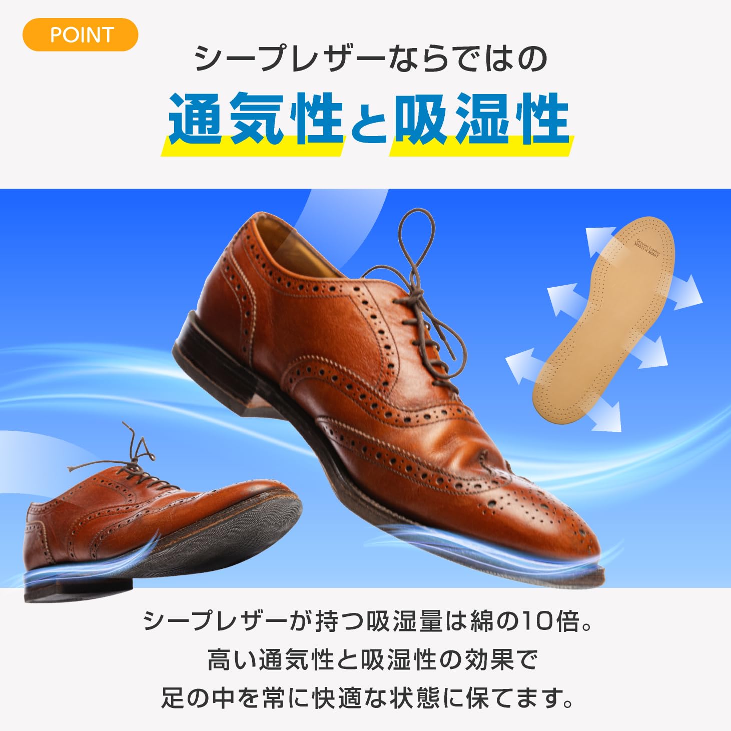 【吸湿性と通気性】羊皮のシープスキンは通気性に優れており足裏のムレやジメジメを防止しさらりとた状態を保ちます