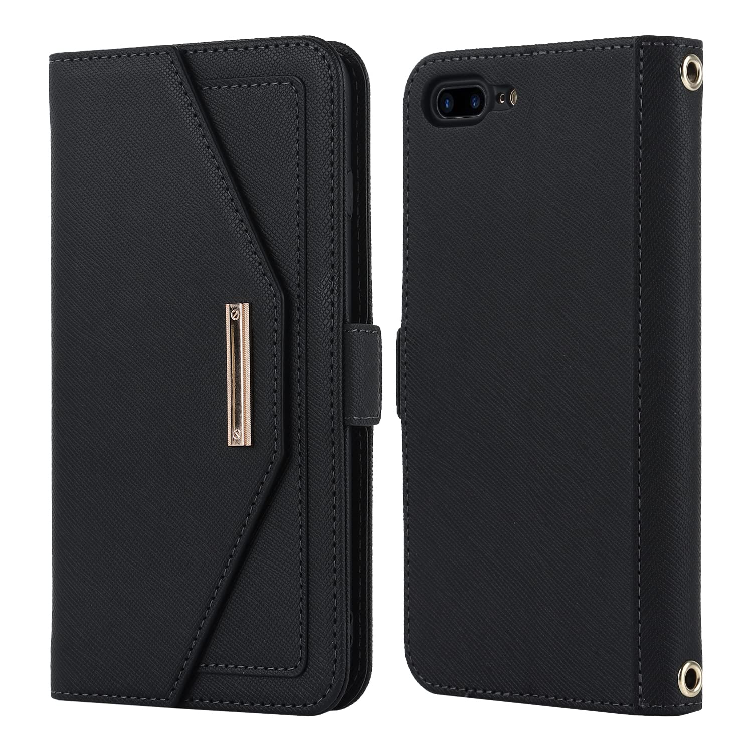 Eastwave アイフォン 8 Plus ケース 縄掛けカバー for iPhone 7 Plus 手帳型 for iPhone 8plus手帳 for iPhone 7plus case チェック柄 鏡 ミラー付き 長ストラップ付き 肩掛け 革レザー 柔らかいTPU 多機能 財布型 カード収納 小銭入 れ スタンド機能 全面保護 5色 ブラック