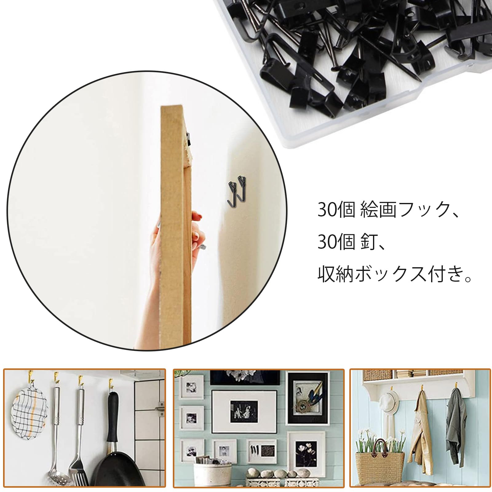 1. 製品仕様&取付簡単:ピンフック*30、針*30、透明収納ケース*1、耐荷重約13.5kg。釘フックは高級金属製で、耐久性・耐食性に優れ、劣化を防ぎます。長く繰り返し使えます。壁によっては、手で押したり、ハンマーで叩いたりできます。取り付けはとても簡単です。