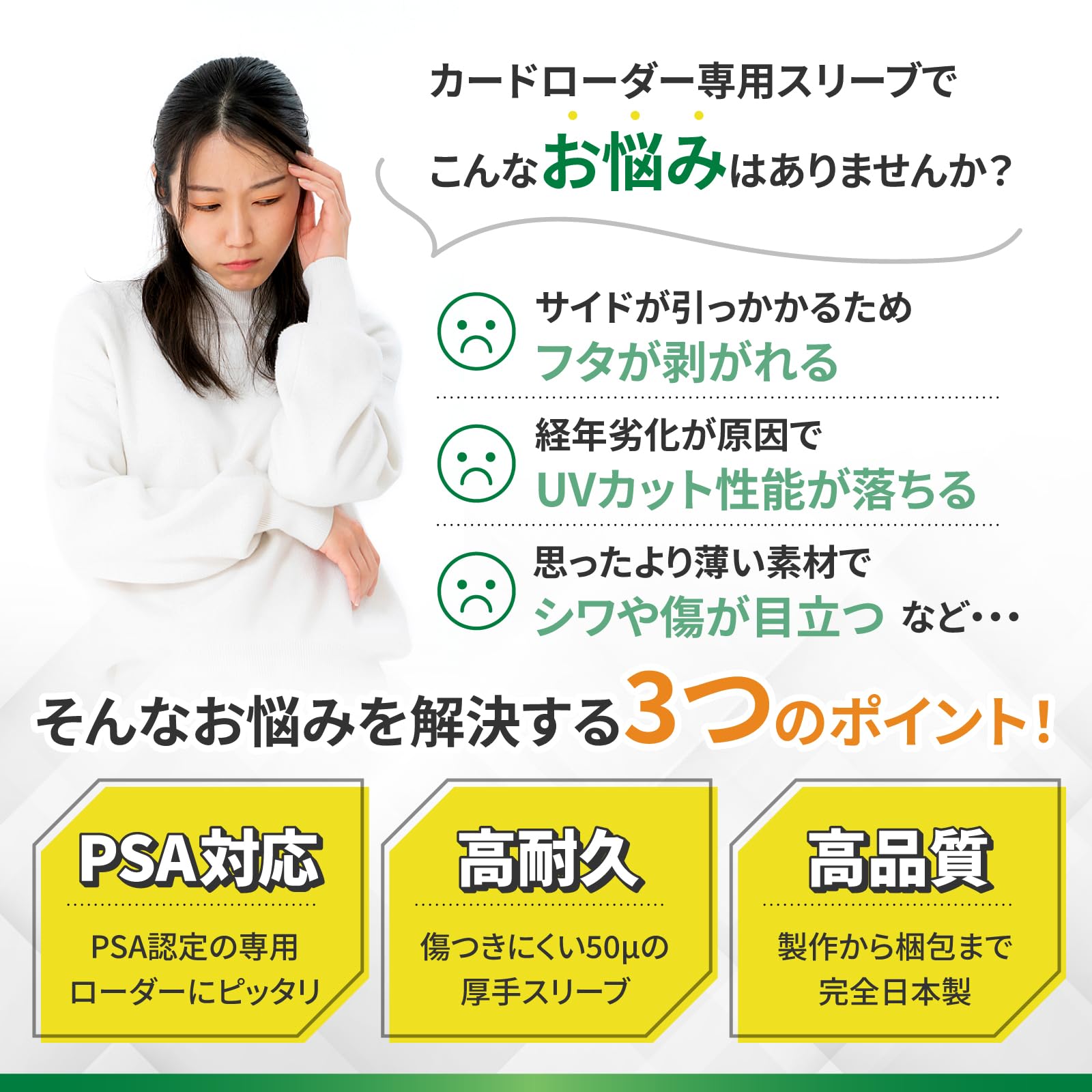 【紫外線遮蔽性試験済み】あらかじめ備えられたUVカット性能も、時間の経過とともに劣化してゆくのをご存じですか?本製品はPSA鑑定用のローダーを、更に保護するための専用スリーブとしてお使いいただけるアイテムです。